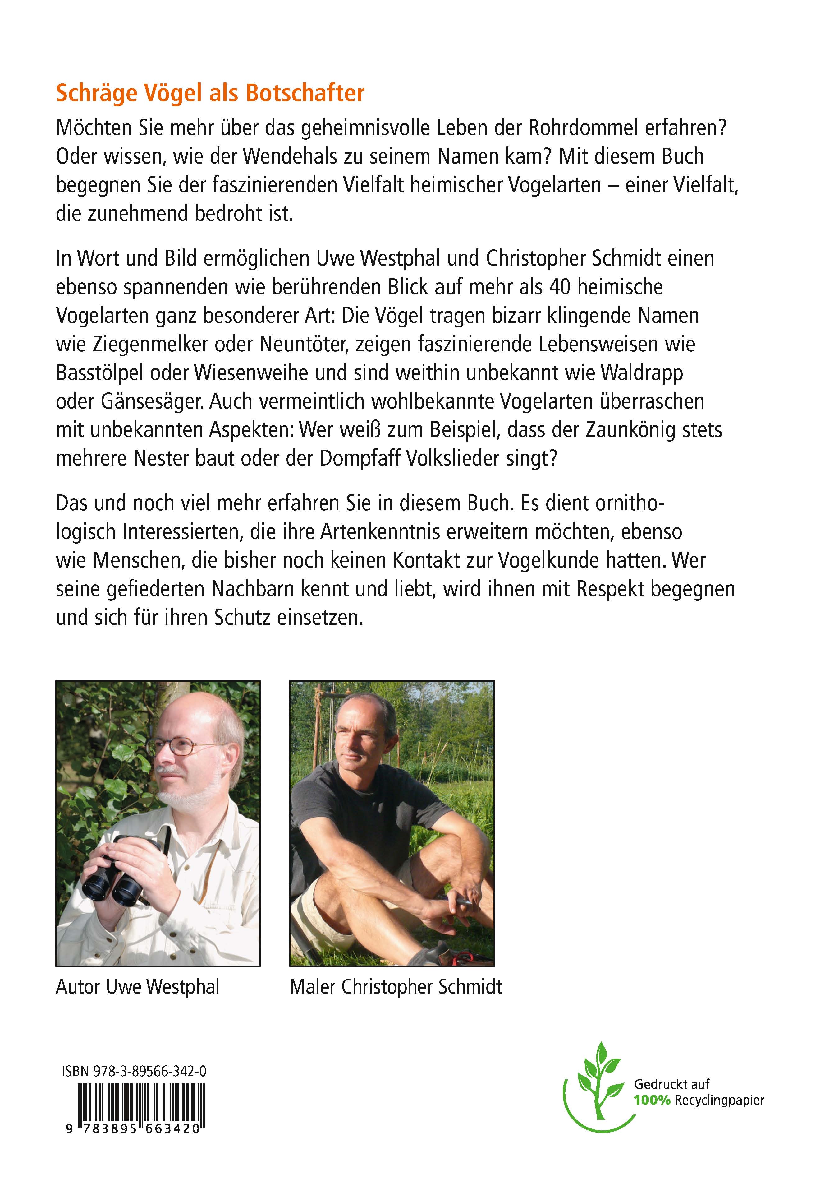 Dr. Uwe Westphal ist Diplom-Biologe und Fachzeitschriftenredakteur. Einem breiten Publikum ist er als Tierstimmenimitator aus Hörfunk und Fernsehen bekannt: Uwe Westphal hat sich die Fähigkeit angeeignet, die Lautäußerungen von unter anderem rund 120 heimischen Vogelarten nachzuahmen oder lautmalerisch zu beschreiben. Nach fast zwanzigjähriger hauptberuflicher Tätigkeit im Naturschutz arbeitet er heute als freier Publizist und Textdienstleister in der Nähe von Hamburg. Seit 1978 begeistert er Menschen auf Exkursionen und Seminaren für die Natur und speziell die Vogelwelt. www.westphal-naturerleben.de