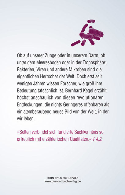 "Atemberaubende Einsichten in die Welt der Mikroben!" Herbert Pardatscher, BÜCHERRUNDSCHAU (AT) "Ein gleichermaßen unterhaltsames wie informatives Buch." Michael Lange, DEUTSCHLANDFUNK "Wir sind nicht allein (...) Bernhard Kegel präsentiert viele interessante Fakten zur Besiedelung unserer Körper durch Bakterien." Norbert Lossau, LITERARISCHE WELT "Die Biologie erlebt gerade eine wahrhaft turbulente Phase, und Bernhard Kegels Buch ist ein ohne Einschränkungen zu empfehlender Führer durch diese aufregenden Zeiten." Thomas Weber, F.A.Z. "Sachbuch mit Spannungsaufbau. Berhard Kegel kann das und noch viel mehr." GESCHICHTENAGENTIN "Fesselnde Lektüre." Peggy Freede, SPEKTRUM "Er zeigt mit großem Fachwissen und einer angenehm verständlichen Sprache, dass Mikroorganismen die Herrscher der Welt sind." Pit Mau, EM JOURNAL "Sehr gut gewähltes Thema. Sehr gut erzählt. Sehr empfehlenswert!" LABOR & MORE "Sein Buch ist höchst lehrreich und ebenso unterhaltsam geschrieben." OÖ NACHRICHTEN "Kegel gelingt es, selbst die schwierigsten Zusammenhänge so zu erhellen, dass jedem ein Licht aufgeht." Klaus Jacob, BILD DER WISSENSCHAFT "Höchst lehrreich und ebenso unterhaltsam." OBERÖSTERREICHISCHE NACHRICHTEN "[...] sehr eingängig und persönlich geschrieben, bleibt nah an dem Wissenschaftlern und macht mit wunderbaren Vergleichen die Materie verständlich. Eine Empfehlung!" Gert Lang, NEUES DEUTSCHLAND "Ein unterhaltsam geschriebenes Sachbuch." Anke Fossgreen, TAGES-ANZEIGER