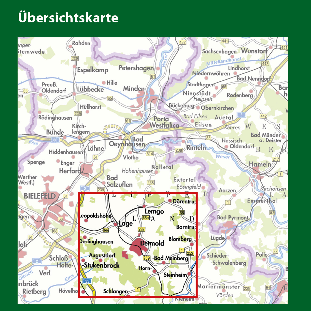 Detmold ist mit mehr als 73.000 Einwohnern die größte Stadt im Kreis Lippe. Das Freilichtmuseum, die Musikhochschule, die Hochschule OWL, das Landestheater sowie das Hermannsdenkmal haben die Stadt überregional und international bekannt gemacht. Die Externsteine in Horn-Bad Meinberg sind ebenfalls über die Landesgrenzen hinaus bekannt. Der Hermannsweg, Teil der Hermannshöhen und ausgewiesener "Qualitätsweg Wanderbares Deutschland", verläuft von Südost nach Nordwest quer durch das Kartenblatt. Weitere Fernwanderwege des Teutoburger-Wald-Vereins sind hier der Cheruskerweg (X3), der Niedersachsenweg (X6), der Runenweg (X7) und der Lönspfad (X10). Auf 57 Kilometern verläuft der Residenzweg rund um Detmold. Ein engmaschiges Netz gut markierter örtlicher Rundwanderwege, die vom Lippischen Heimatbund betreut werden, macht den Wanderspaß komplett. Die neuen Wanderkarten Teutoburger Wald beruhen auf den amtlichen Kartengrundlagen der Geobasis NRW und wurden in Zusammenarbeit mit Wanderfreunden aus der Region und den örtlichen Tourismusinformationen entwickelt. Sie laden die Wanderer ein, die Schönheiten und Reize der Natur, die Ortschaften und Städte zu erkunden, auf malerischen oder attraktiven Wegen. Das neue Kartenmaterial versorgt mit allen wichtigen Informationen auf Sehenswürdigkeiten, Restaurants etc., die unterwegs vonnöten sind. Weitere Wanderkarten, die erhältlich sind: Südliches Tecklenburger Land, Nördliches Tecklenburger Land, Wandern rund um Rheine, Lippischer Südosten, Nordlippisches Bergland, Südlicher Teutoburger Wald und Nördlicher Teutoburger Wald.