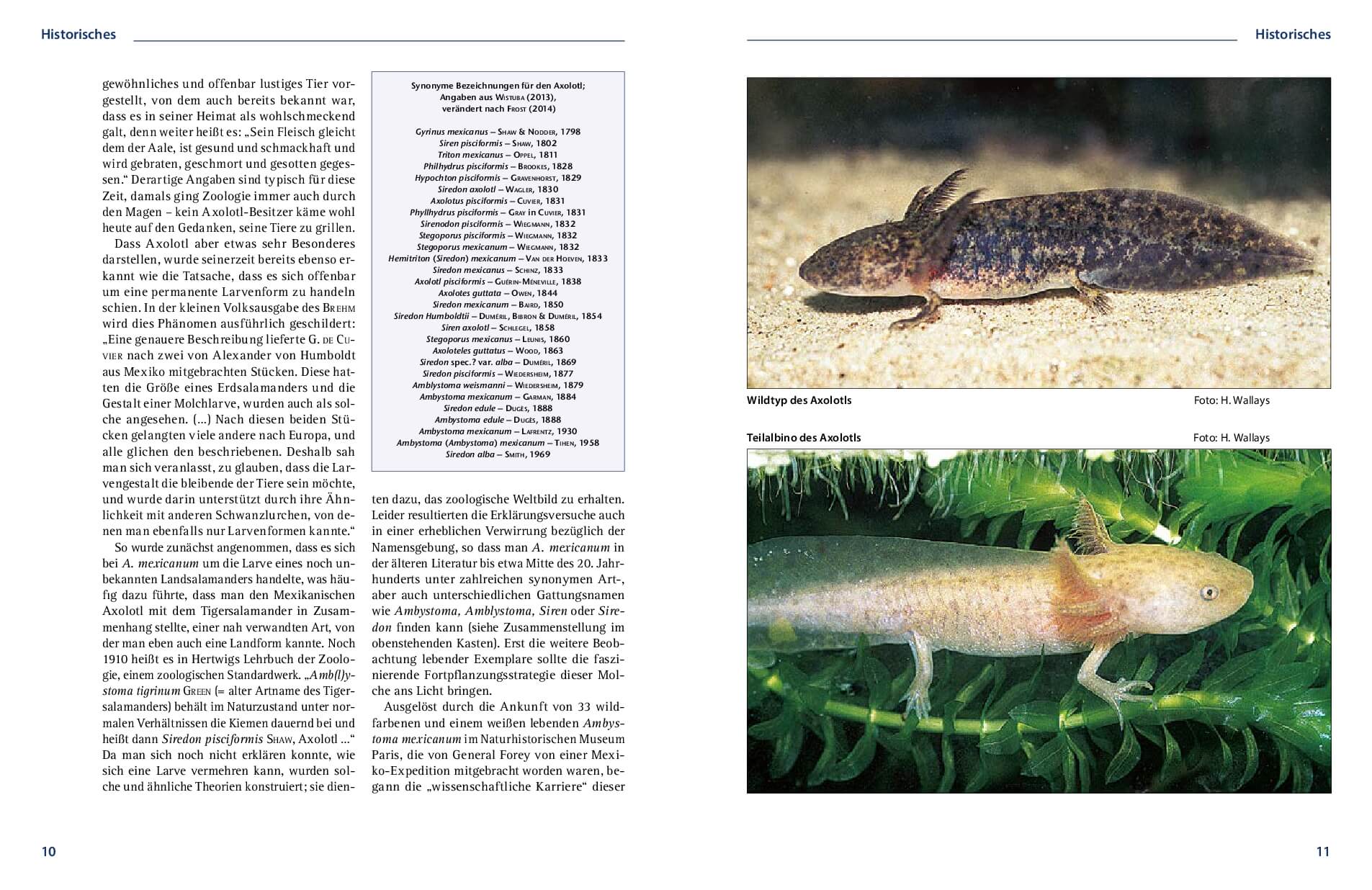 Axolotl sind allseits bekannt als die Salamander, die sich im Larvenstadium vermehren können. Aber nicht nur diese biologische Besonderheit und ihr bizarres Aussehen machen sie zu beliebten Pfleglingen, sie sind auch sehr gut im Zimmeraquarium zu halten und nachzuzüchten. Der Autor geht ausführlich auf die Herkunft, Haltung, Vermehrung und Krankheiten der Axolotl ein und erklärt außerdem die Biologie der faszinierenden "Wassermonster". Selbstverständlich werden alle Farbschläge und Hybridformen vorgestellt.