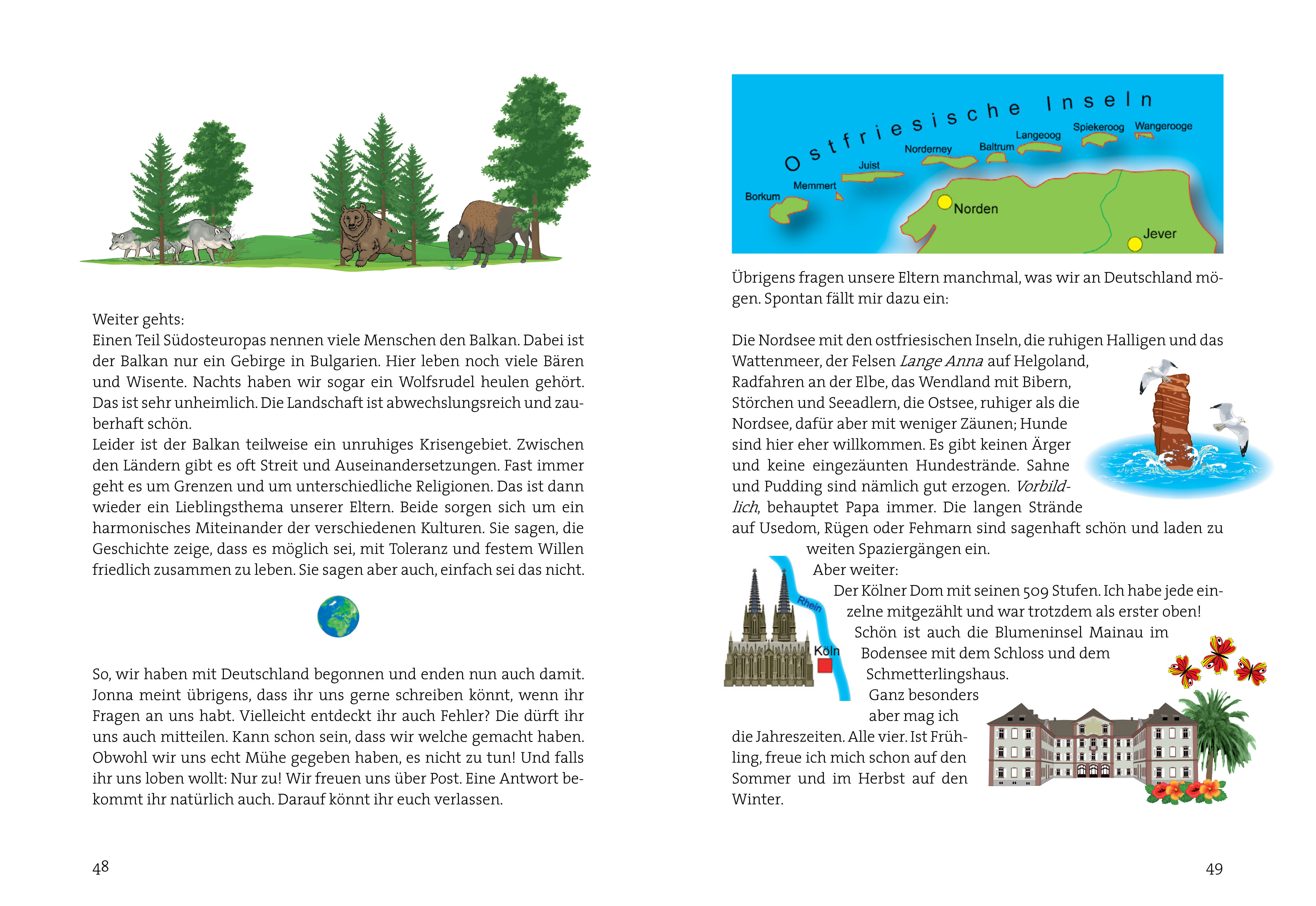 Jonna und Joris haben viel über ihre Reisen durch Kontinente zu erzählen und berichten von Abenteuern und Begegnungen mit Menschen und Tieren. Witzig und unterhaltsam, voller Wissen, Anregungen und Beobachtungen. Zeitgeschehen, kritische Fragen und gut gelaunte Kommentare werden durch zahlreiche Karten und liebevolle Illustrationen ergänzt. Diese Reportage für Kinder von Kindern ist ein Geschenk für alle, die lachen, staunen und sich immer wieder über die Welt, in der wir leben, freuen wollen.