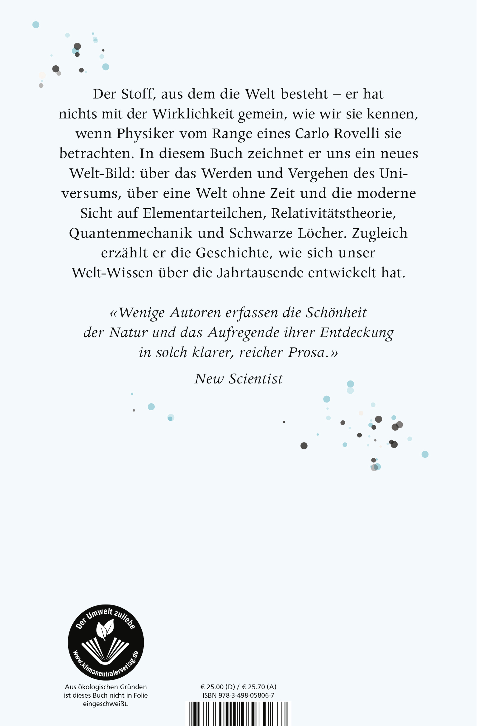 Ein großer Physiker unserer Zeit macht sich auf, uns ein neues Welt-Bild zu zeichnen: mit einem physikalischen Universum ohne Zeit, einer Raumzeit, die aus Schleifen und Körnchen besteht und in der Unendlichkeit nicht existiert. Einer Kosmologie, die ohne Urknall und Paralleluniversen auskommt und hier zum ersten Mal von einem ihrer «Erfinder» für ein breites Publikum einfach und ausführlich erklärt wird. Ein Buch über "die großen Herausforderungen der gegenwärtigen Naturwissenschaften, die all unser Wissen über die Natur in Frage stellen" (Rovelli).