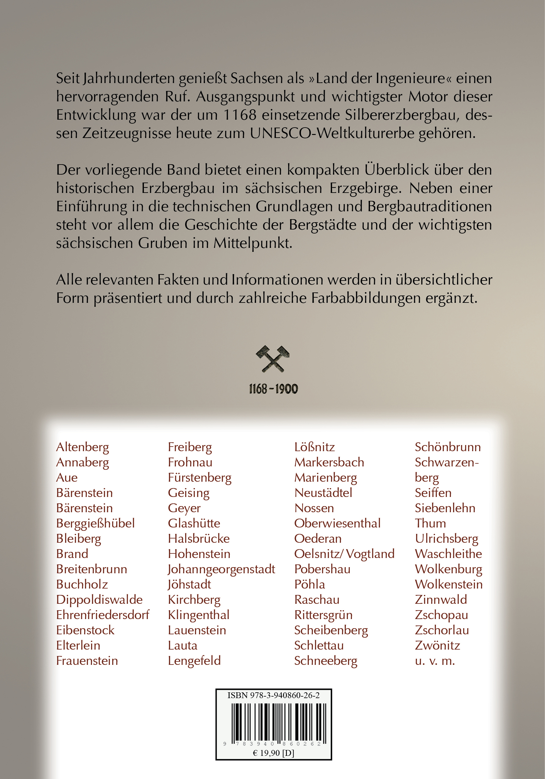 | Schlagworte | Albernau • Altenberg • Altgeising • Annaberg • Annaberg-Buchholz • Anstonsthal • Aue • Bärenstein • Beierfeld • Bergbau • Bergbau, Geschichte • Berggeschrei • Berggeschrey • Berggießhübel • Berghabit • Bergmannstracht • Bergstadt • Bergstädte • Bergwerke • Bermsgrün • Bernsbach • Besucherbergwerk • Blaufarbenwerk • Bleiberg • Brand-Erbisdorf • Breitenbrunn • Bruderschaft • Brüderschaft • Buchholz • Carlsfeld • Chemnitz • Crandorf • Dippoldiswalde • Drebach • Dresden • Ehrenfriedersdorf • Eibenstock • Elterlein • erla • Erlabrunn • Erz • Erzbergbau • Erzgebirge • Freiberg • Frohnau • Fürstenberg • Geising • Georgenfeld • Geowissenschaften, Geographie, Umwelt, Planung • Geschichte • Geschichte und Archäologie • Geyer • Glashütte • Gruben • Grünhain • Habit • Halsbrücke • Hartenstein • Hohenstein • Hüttenwesen • Industrie • Johanngeorgenstadt • Jöhstadt • Kirchberg • Klingenthal • Knappschaft • Kobalt • Kulturerbe • Langenberg • Lauenstein • Lengefeld • Lößnitz • Marienberg • Markersbach • Mittweida • Neustädtel • Niederpfannenstiel • Oberwiesenthal • Oederan • Oelsnitz • Olbernhau • Pobershau • Pöhla • Raschau • Rittersgrün • Rothschönberg • Sachsen • Sachsen, Geschichte; Sozial-/Wirtschafts-G. • Schacht • Scheibenberg • Schlema • Schneeberg • Schönbrunn • Schwarzenberg • Seiffen • Siebenlehn • Silber • Stollen • Stolln • Technikgeschichte • Thum • UNESCO • Waschleithe • Welterbe • Wolkenburg • Wolkenstein • Zinnwald • Zschopau • Zschorlau • Zwickau • Zwönitz |