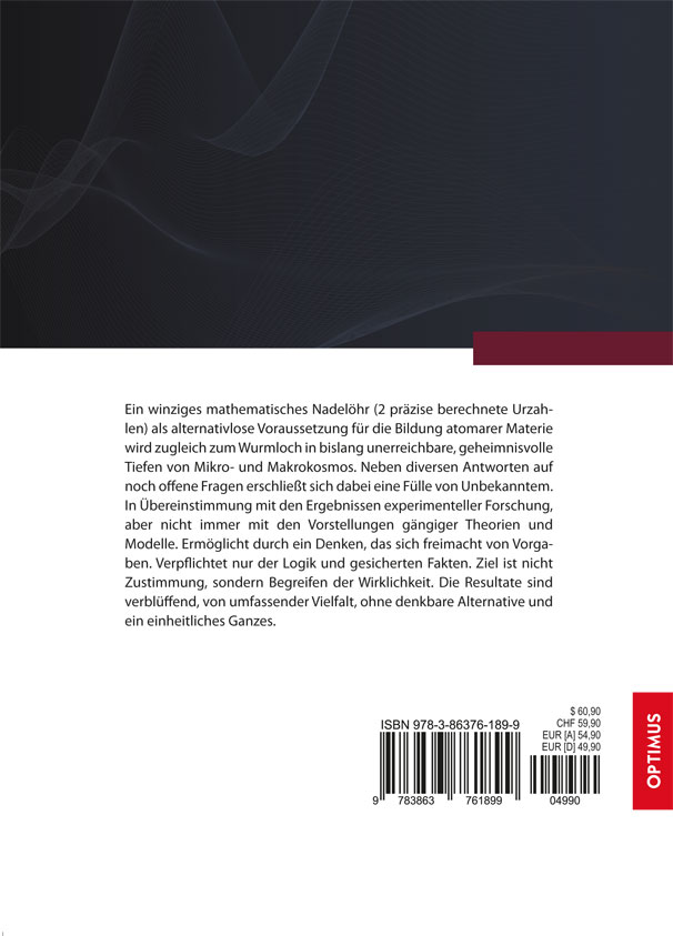 Ein winziges mathematisches Nadelöhr (2 präzise berechnete Urzah-len) als alternativlose Voraussetzung für die Bildung atomarer Materie wird zugleich zum Wurmloch in bislang unerreichbare, geheimnisvolle Tiefen von Mikro- und Makrokosmos. Neben diversen Antworten auf noch offene Fragen erschließt sich dabei eine Fülle von Unbekanntem. In Übereinstimmung mit den Ergebnissen experimenteller Forschung, aber nicht immer mit den Vorstellungen gängiger Theorien und Modelle. Ermöglicht durch ein Denken, das sich freimacht von Vorgaben. Verpflichtet nur der Logik und gesicherten Fakten. Ziel ist nicht Zustimmung, sondern Begreifen der Wirklichkeit. Die Resultate sind verblüffend, von umfassender Vielfalt, ohne denkbare Alternative und ein einheitliches Ganzes.