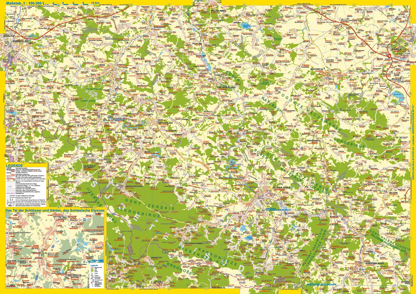 Aktuelle Detaillierte Landkarte des landschaftlich äußerst reizvollen Teiles Niederschlesiens, der sich östlich der Neiße von Görlitz bis Liegnitz/Legnica und von Bunzlau/Boleslawiec bis zum Iser- und Riesengebirge erstreckt.