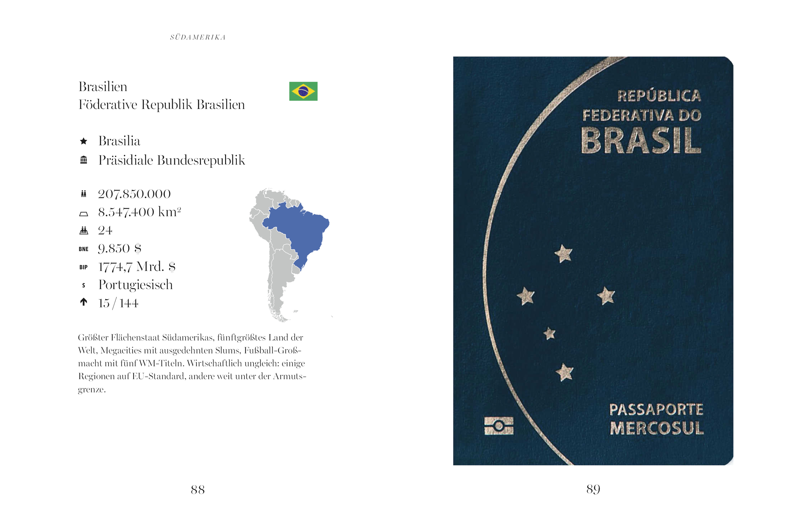 Dieses Buch bildet die Umschlagvorderseiten der rund 220 Reisepässe der Welt ab, geordnet nach Kontinenten. Begleitet werden die Abbildungen durch informative Einträge zum jeweiligen Land: die geografischen und politischen Fakten, gesprochene Sprachen, Mitgliedschaften in internationalen politischen Organisationen sowie einen Index zur Visafreiheit. Das attraktive Handbuch mit klarer Gestaltung und hohem Objektcharakter vermittelt damit ganz praktisch, welche einzigartige Bedeutung ein Ausweis rund um die Welt besitzt.
