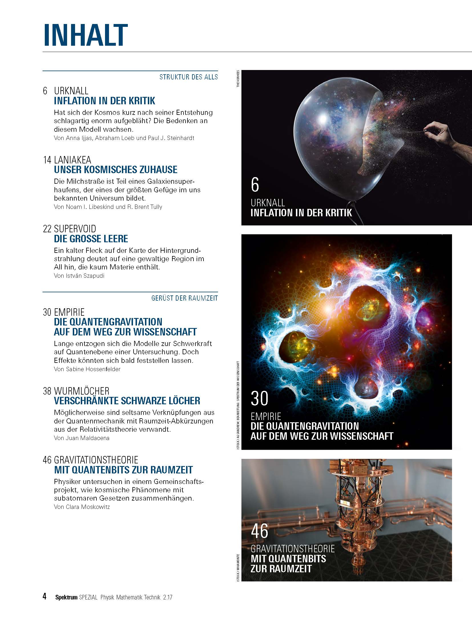 | Schlagworte | Dunkle Materie • Gravitationswellen • Kosmologie; Einführung (pop.) • Kosmologie und das Universum • Laniakea • Milchstraße • Quantengravitation • RaumZeit • Schwarze Löcher • Supervoid • Theoretische und mathematische Astronomie • Urknall • Wurmlöcher • Zeitschrift/Magazin |