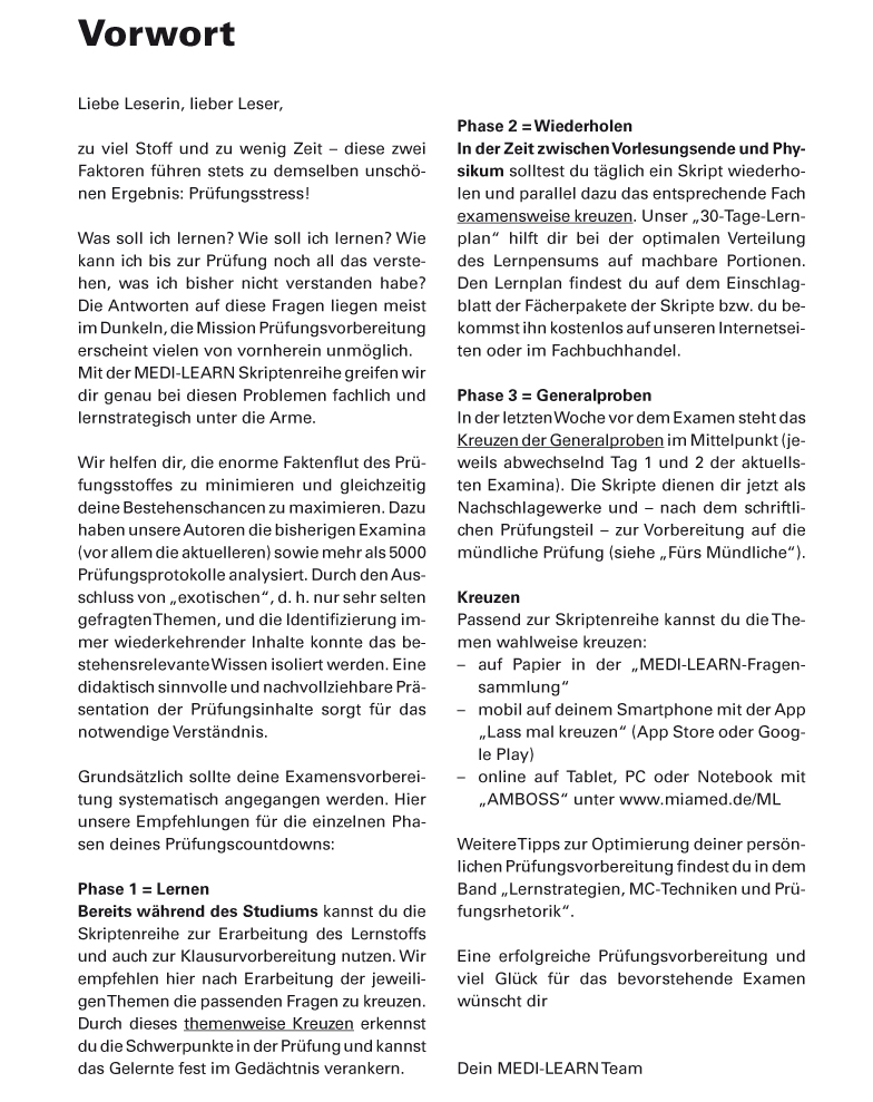 Liebe Leserin, lieber Leser,zu viel Stoff und zu wenig Zeit - diese zwei Faktoren führen stets zu demselben unschönen Ergebnis: Prüfungsstress!Was soll ich lernen? Wie soll ich lernen? Wie kann ich bis zur Prüfung noch all das verstehen,was ich bisher nicht verstanden habe? Die Antworten auf diese Fragen liegen meist im Dunkeln, die Mission Prüfungsvorbereitung erscheint vielen von vornherein unmöglich.Mit der MEDI-LEARN Skriptenreihe greifen wir dir genau bei diesen Problemen fachlich undlernstrategisch unter die Arme.Wir helfen dir, die enorme Faktenflut des Prüfungsstoffes zu minimieren und gleichzeitig deine Bestehenschancen zu maximieren. Dazu haben unsere Autoren die bisherigen Examina(vor allem die aktuelleren) sowie mehr als 5000 Prüfungsprotokolle analysiert. Durch den Ausschluss von "exotischen", d. h. nur sehr selten gefragten Themen, und die Identifizierung immer wiederkehrender Inhalte konnte das bestehensrelevante Wissen isoliert werden. Einedidaktisch sinnvolle und nachvollziehbare Präsentation der Prüfungsinhalte sorgt für das notwendige Verständnis.Grundsätzlich sollte deine Examensvorbereitung systematisch angegangen werden. Hier unsere Empfehlungen für die einzelnen Phasen deines Prüfungscountdowns:Phase 1 = LernenBereits während des Studiums kannst du die Skriptenreihe zur Erarbeitung des Lernstoffs und auch zur Klausurvorbereitung nutzen. Wir empfehlen hier nach Erarbeitung der jeweiligen Themen die passenden Fragen zu kreuzen.Durch dieses themenweise Kreuzen erkennst du die Schwerpunkte in der Prüfung und kannst das Gelernte fest im Gedächtnis verankern.Phase 2 = WiederholenIn der Zeit zwischen Vorlesungsende und Physikum solltest du täglich ein Skript wiederholen und parallel dazu das entsprechende Fach examensweise kreuzen. Unser "30-Tage-Lernplan" hilft dir bei der optimalen Verteilung des Lernpensums auf machbare Portionen.Den Lernplan findest du auf dem Einschlagblatt der Fächerpakete der Skripte bzw. du bekommst ihn kostenlos auf unseren Internetseiten oder im Fachbuchhandel.Phase 3 = GeneralprobenIn der letzten Woche vor dem Examen steht das Kreuzen der Generalproben im Mittelpunkt (jeweils abwechselnd Tag 1 und 2 der aktuellsten Examina). Die Skripte dienen dir jetzt alsNachschlagewerke und - nach dem schriftlichen Prüfungsteil - zur Vorbereitung auf diemündliche Prüfung (siehe "Fürs Mündliche").KreuzenPassend zur Skriptenreihe kannst du die Themen wahlweise kreuzen:- auf Papier in der "MEDI-LEARN-Fragensammlung"- mobil auf deinem Smartphone mit der App "Lass mal kreuzen" (App Store oder GooglePlay)- online auf Tablet, PC oder Notebook mit "AMBOSS" unter www.miamed.de/MLWeitere Tipps zur Optimierung deiner persönlichen Prüfungsvorbereitung findest du in demBand "Lernstrategien, MC-Techniken und Prüfungsrhetorik".Eine erfolgreiche Prüfungsvorbereitung und viel Glück für das bevorstehende Examenwünscht dirDein MEDI-LEARN Team