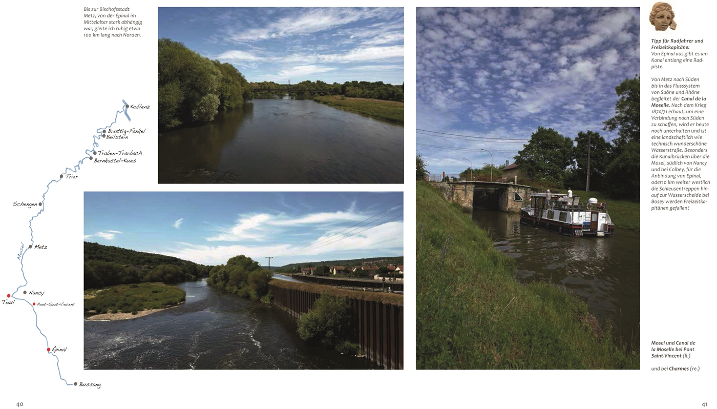 Gestatten: Mosella 12Meine Urgeschichte 12Wie meine schönen Schleifen entstanden 13Lothringen - La Lorraine: 15Kulturgeschichtlicher Hintergrund des MosellandesMeine Kinderstube in den südlichen Vogesen 18Bussang 26Remiremont 27Vier Städte am Fluss 32Épinal - Die Bilderbogenstadt 34Toul - Stadt am Flusswinkel 42Nancy - Stadt des Jugendstils 50Metz - Stolze Reichsstadt mit südländischem Flair 64Schengen - Die Mosel zeigt ihr europäisches Gesicht 74Trier - Älteste Stadt Deutschlands 78Weinland Mosel 86Bernkastel-Kues - Fachwerkidylle und Gelehrter Nikolaus von Kues 96Traben-Trarbach - Festungsbollwerk und Jugendstilschönheit 106Beilstein - Das Dornröschen der Mosel 116Bruttig-Fankel - Eine typische Gemeinde der Mittelmosel 122Koblenz - Wo Mosel und Rhein sich küssen 134Literatur 142Bildnachweis 144