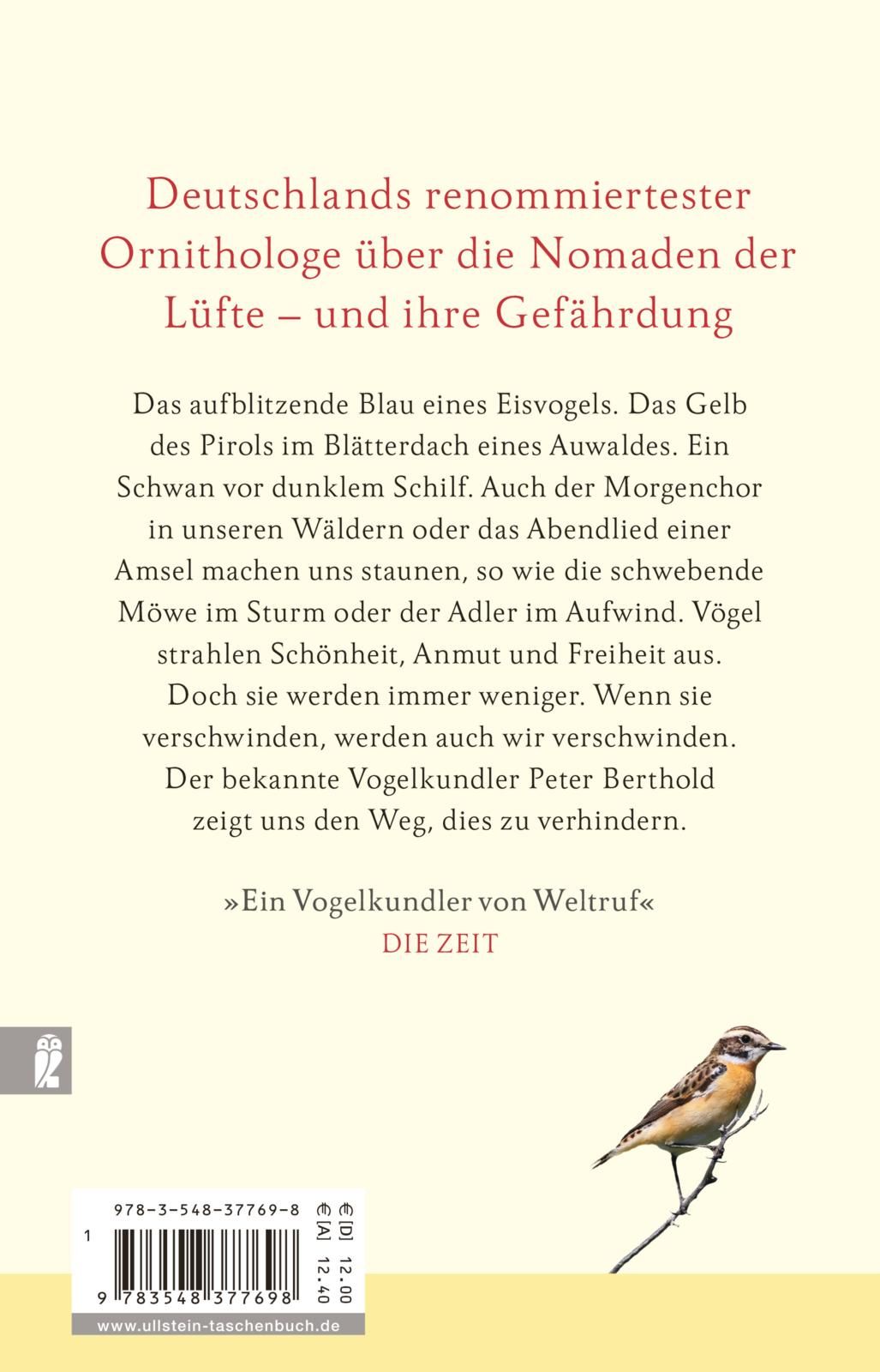 Peter Berthold, geboren 1939, ist Ornithologe und Verhaltensforscher. Von 1981 bis 2005 war er Professor für Biologie an der Universität Konstanz, ab 1998 bis zu seiner Emeritierung Direktor des Max-Planck-Instituts für Ornithologie. Er hat das ornithologische Standardwerk „Vogelzug“ verfasst sowie den Bestseller „Vögel füttern, aber richtig“. 2001 war er Berater für den legendären Kinofilm „Nomaden der Lüfte“. Berthold erhielt viele Auszeichnungen und beschäftigt sich unter anderem mit den Folgen des Klimawandels.