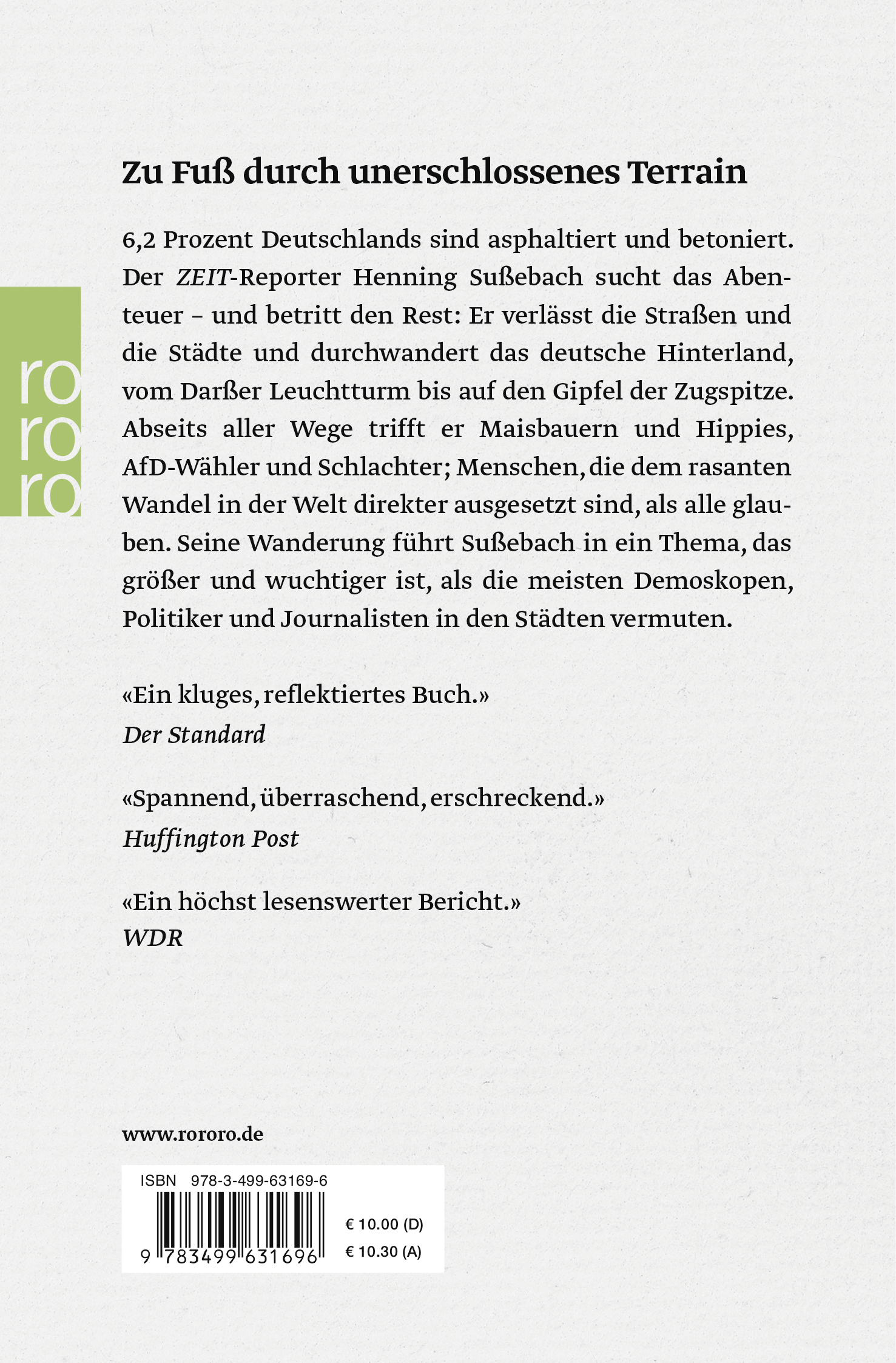 lt;p>Der preisgekrönte ZEIT -Reporter Henning Sußebach verlässt die Straßen und die Städte und durchwandert das deutsche Hinterland. Er gelangt in Gegenden, die wir kaum kennen, obwohl sie vor unserer Haustür liegen, und zu Menschen, die das Land bewirtschaften, aber von Städtern kaum wahrgenommen werden. Und es reift die beunruhigende Erkenntnis: Die gesellschaftliche Spaltung verläuft nicht allein zwischen Armen und Reichen, sondern vor allem zwischen Stadt und Land. Sußebach erzählt mit großer literarischer Kraft von seiner Reise, auf der er die Straßen verließ und eine andere Welt entdeckte.