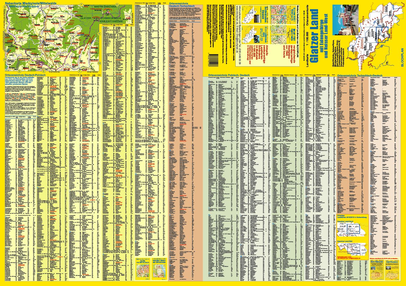 Detaillierte aktuelle Landkarte des Glatzer Landes (Grafschaft Glatz) zwischen Schlesien und Böhmen - heute in Polen gelegen - und der nördlich daran anschließenden Gebiete mit Münsterberger Bergland und dem westlichen Glatzer Land nebst allen hier befindlichen Teilen des Gebirgszuges der Sudeten wie z.B. dem Eulengebirge, dem Heuscheuergebirge, dem Glatzer Schneegebirge oder dem Adlergebirge. Darstellung selbst der kleinsten und auch der seit 1945 verschwundenen Orte - mit allen Ortsnamen in Deutsch, Polnisch bzw. Tschechisch.