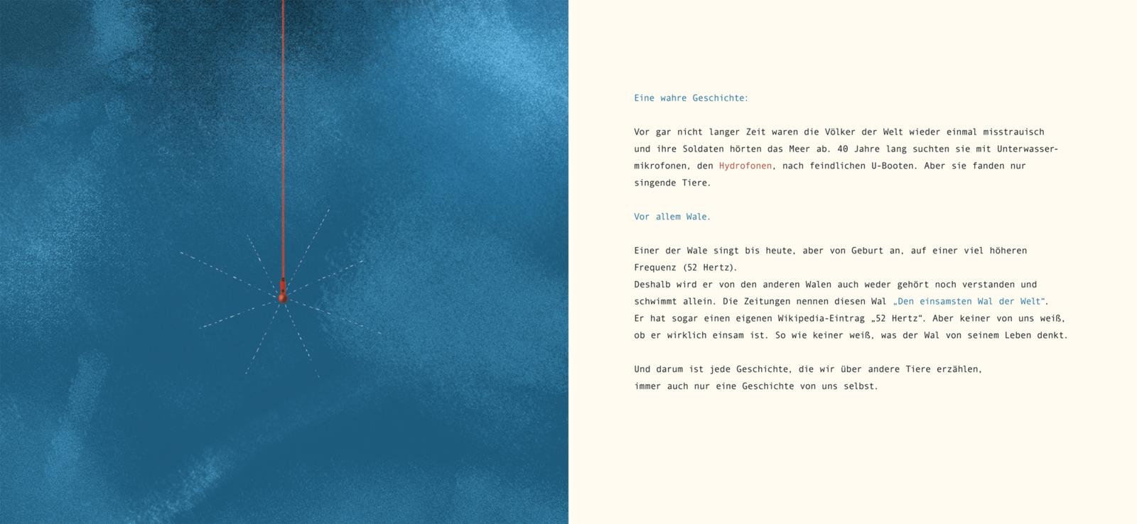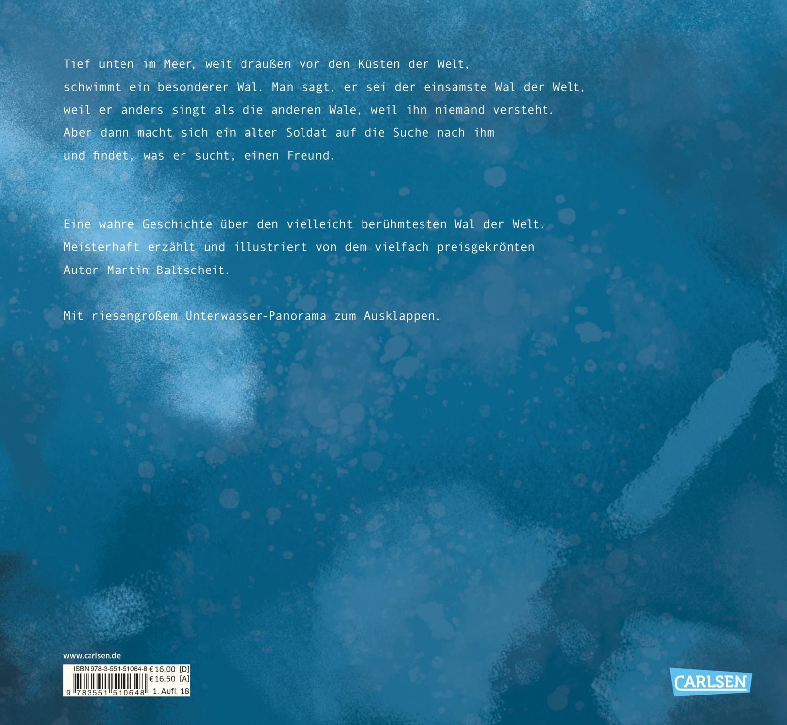 lt;p>Es gibt einen Wal, dessen zu hohe Stimme die anderen Wale nicht hören können. 1989 wurde an der Westküste der USA von einem U-Boot-Abwehr-Hydrophon der US-Marine erstmals der Gesang eines Wales aufgenommen, der aufgrund eines angeborenen Sprachfehlers viel, viel höher sang als alle anderen Wale. Man geht davon aus, dass andere Wale ihn nicht hören und er andere nicht hören kann. Der Wal lebt unter dem Namen "52 Hertz" als "der einsamste Wal der Welt" allein im Pazifik und wird seit Jahren wissenschaftlich begleitet. Martin Baltscheit erzählt und illustriert seine bewegende Geschichte.