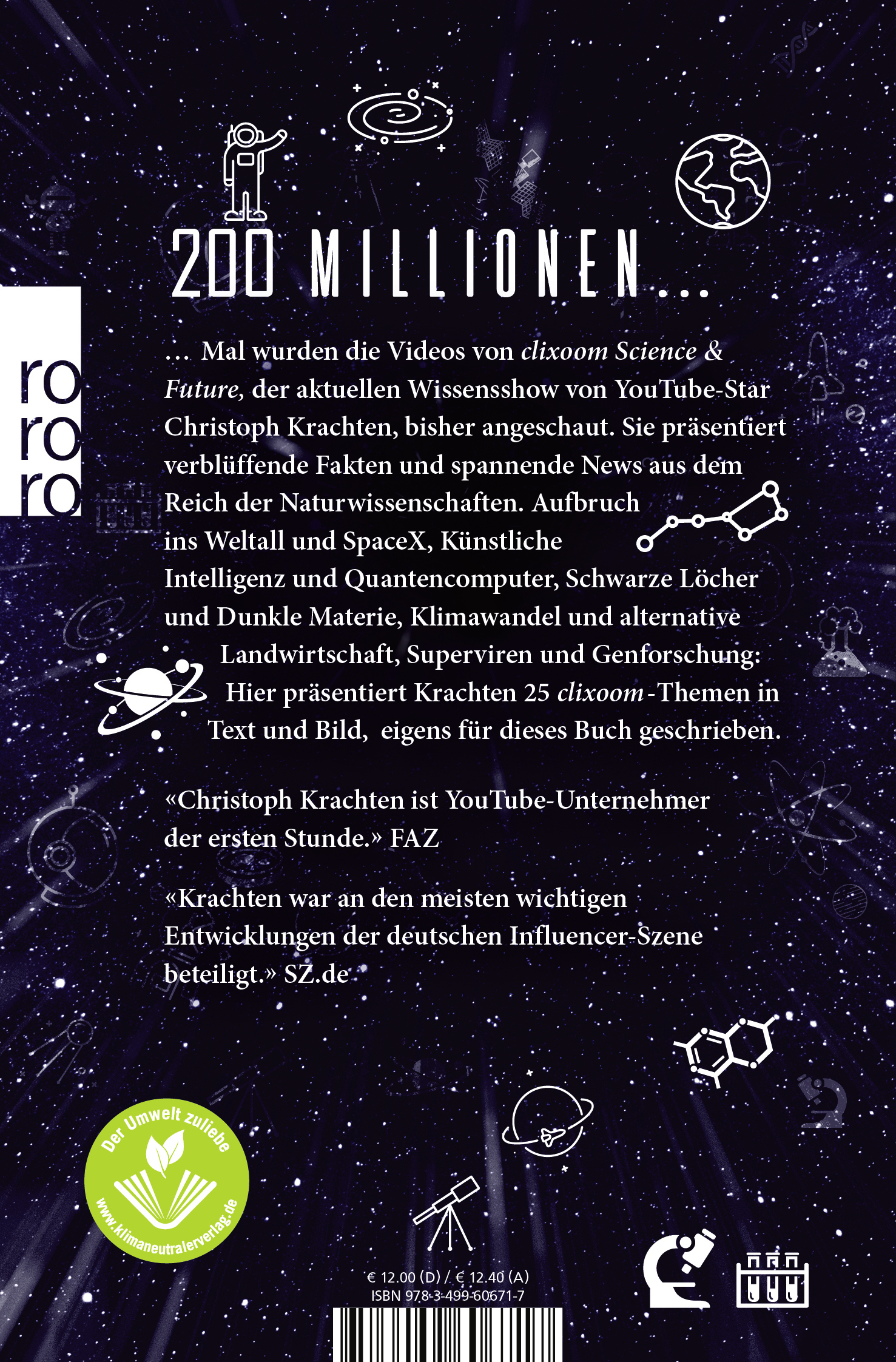 Ist doch noch Leben auf dem Mars entdeckt worden? Und waren Aliens auf dem Roten Planeten? Was macht die Jagd auf Planet neun jenseits der Neptunbahn? Wann wird die erste Kopftransplantation möglich? Wie geht es weiter mit dem Quantencomputer? Und warum hat es hundert Jahre gedauert, bis der zweite Mond um die Erde entdeckt wurde? Diese und andere Geheimnisse - alles Fragen, die die Forschung beschäftigen-, lüftet YouTube-Star Christoph Krachten auf seinem Kanal clixoom - und jetzt in diesem Buch. Verblüffende Fakten und spannende Spekulationen aus dem Reich der Naturwissenschaften.