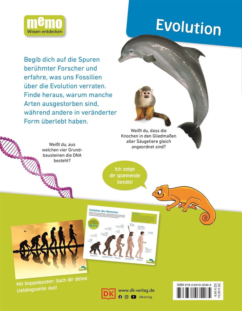 Die Geschichte der menschlichen Evolution verstehen: In "memo Wissen entdecken" wird Dawins Entwicklungstheorie vorgestellt, Fossilienfunde gezeigt oder Stammbäume erklärt. Die beliebte Sachbuchreihe verpackt faszinierendes Wissen für Kinder in kurze, lesefreundliche Texte und viele detailreiche Bilder. Jetzt sogar im frischen, übersichtlichen neuen Layout und mit einem illustrierten Chamäleon-Charakter, der durchs Buch begleitet und beeindruckende Details erklärt oder kommentiert. Dazu gibt's ein beidseitig bedrucktes Poster zum Aufhängen im Kinderzimmer - mit einem spektakulären Foto auf der einen und einer informativen Grafik auf der anderen Seite.