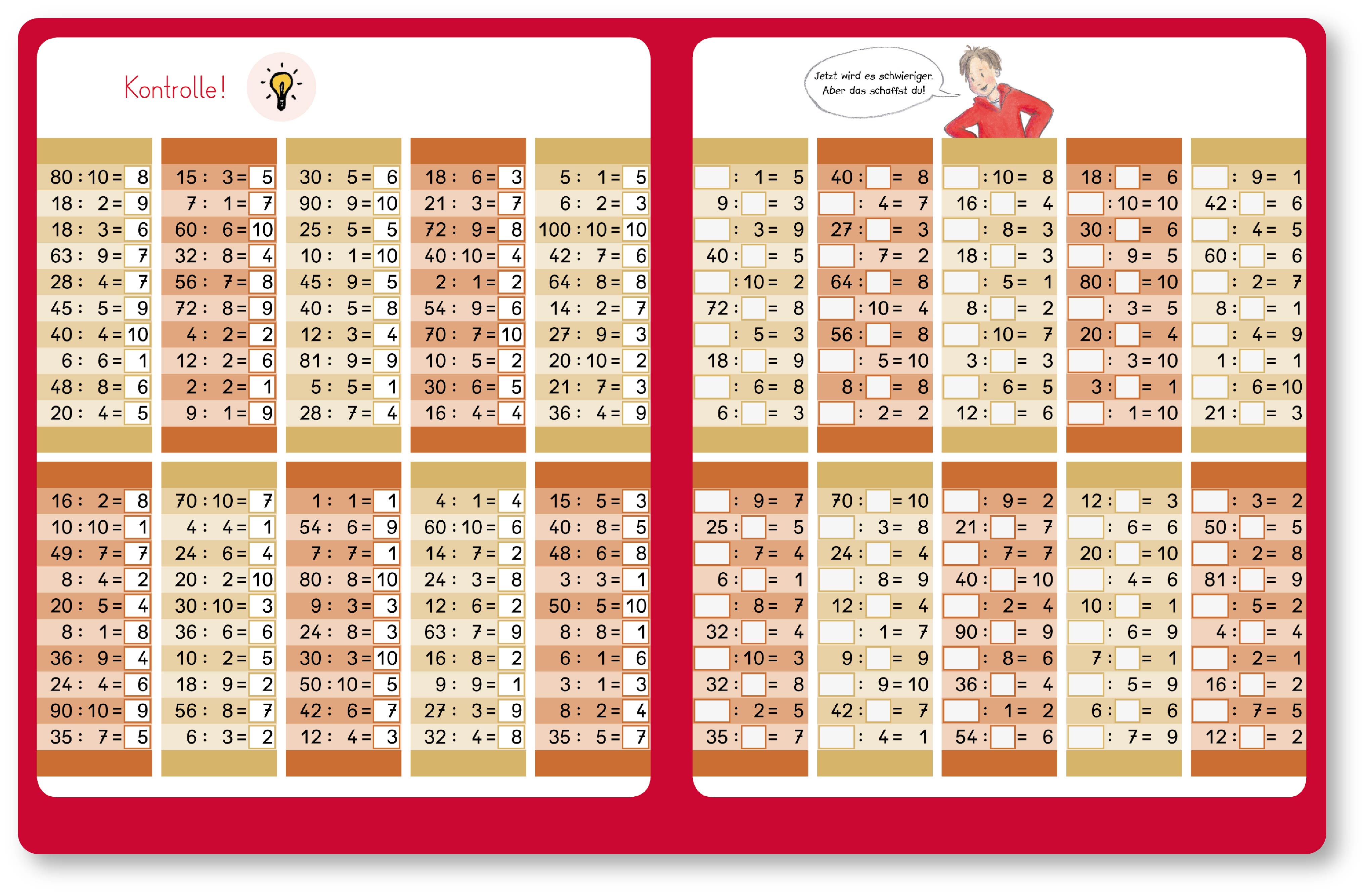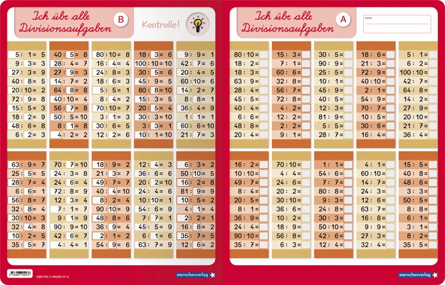 Jedes Kind kann auf den 2 Rückseiten die Aufgaben rechnen und die Ergebnisse dort eintragen. Mit Hilfe der Vorderseiten erfolgt dann die Selbstkontrolle. Die Divisionsaufgaben sind unterschiedlich angeordnet und können immer wieder geübt werden.