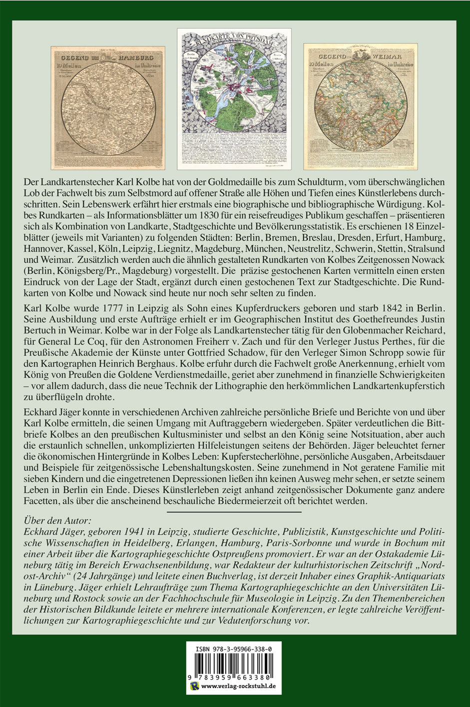 Der Landkartenstecher Karl Kolbe hat von der Goldmedaille bis zum Schuldturm, vom überschwänglichen Lob der Fachwelt bis zum Selbstmord auf offener Straße alle Höhen und Tiefen eines Künstlerlebens durchschritten. Sein Lebenswerk erfährt hier erstmals eine biographische und bibliographische Würdigung. Kolbes Rundkarten – als Informationsblätter um 1830 für ein reisefreudiges Publikum geschaffen – präsentieren sich als Kombination von Landkarte, Stadtgeschichte und Bevölkerungsstatistik. Es erschienen 18 Einzelblätter (jeweils mit Varianten) zu folgenden Städten: Berlin, Bremen, Breslau, Dresden, Erfurt, Hamburg, Hannover, Kassel, Köln, Leipzig, Liegnitz, Magdeburg, München, Neustrelitz, Schwerin, Stettin, Stralsund und Weimar. Zusätzlich werden auch die ähnlich gestalteten Rundkarten von Kolbes Zeitgenossen Nowack (Berlin, Königsberg/Pr., Magdeburg) vorgestellt. Die präzise gestochenen Karten vermitteln einen ersten Eindruck von der Lage der Stadt, ergänzt durch einen gestochenen Text zur Stadtgeschichte. Die Rundkarten von Kolbe und Nowack sind heute nur noch sehr selten zu finden.