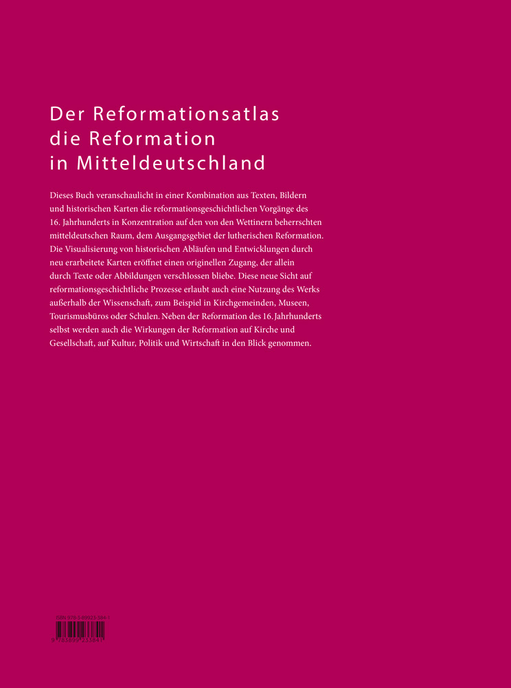 | Zusatzinfo | Übersichtskarten über: Bistümer, Kirchenpatrozinien, Wallfahrten und Gnadenorte, Altstraßen und Handelswege, die Leipziger Teilung 1485, Luthers Romreise, Lebens- und Wirkungsorte Philipp Melanchthons, Martin Luthers, Thomas Müntzers, reformatorische Kirchenordnungen, evangelische Visitationen, Täuferbewegung, Korrespondenzorte Melanchthons, die Reformation im Fürstentum Anhalt, konfessionelle Bündnisse 1525/26, Schmalkaldische Bund, Nürnberger Bund, Religionsgespräche und viele weitere Themen des Buches |
