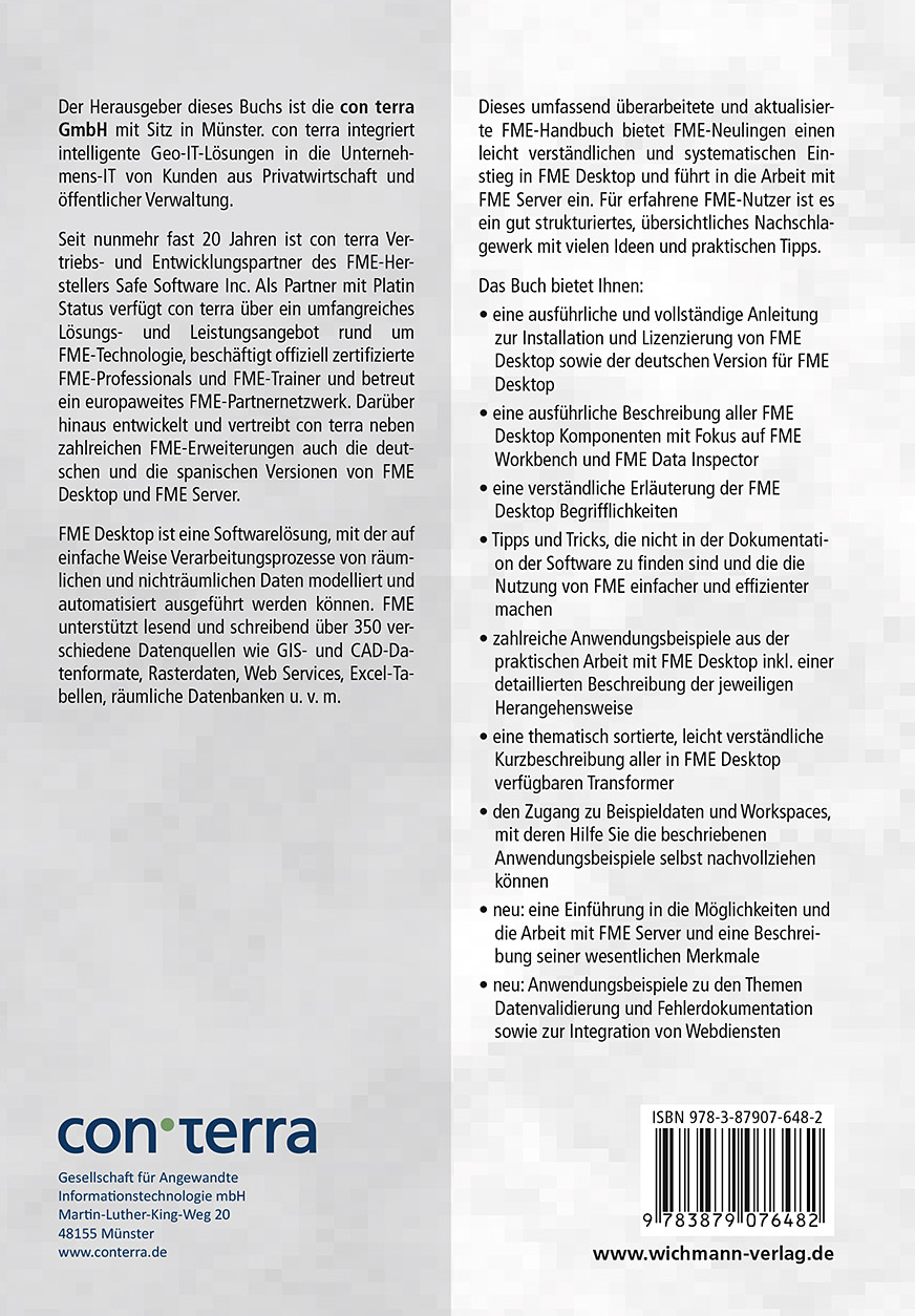 Dieses umfassend überarbeitete und aktualisierte FME-Handbuch bietet FME-Neulingen einen leicht verständlichen und systematischen Einstieg in FME Desktop und führt in die Arbeit mit FME Server ein. Für erfahrene FME-Nutzer ist es ein gut strukturiertes, übersichtliches Nachschlagewerk mit vielen Ideen und praktischen Tipps.Das Buch bietet Ihnen:- eine ausführliche und vollständige Anleitung zur Installation und Lizenzierung von FME Desktop sowie der deutschen Version für FME Desktop- eine ausführliche Beschreibung aller FME Desktop Komponenten mit Fokus auf FME Workbench und FME Data Inspector- eine verständliche Erläuterung der FME Desktop Begrifflichkeiten- Tipps und Tricks, die nicht in der Dokumentation der Software zu finden sind und die die Nutzung von FME einfacher und effizienter machen- zahlreiche Anwendungsbeispiele aus der praktischen Arbeit mit FME Desktop inkl. einer detaillierten Beschreibung der jeweiligen Herangehensweise- eine thematisch sortierte, leicht verständliche Kurzbeschreibung aller in FME Desktop verfügbaren Transformer- den Zugang zu Beispieldaten und Workspaces, mit deren Hilfe Sie die beschriebenen Anwendungsbeispiele selbst nachvollziehen können- neu: eine Einführung in die Möglichkeiten und die Arbeit mit FME Server und eine Beschreibung seiner wesentlichen Merkmale- neu: Anwendungsbeispiele zu den Themen Datenvalidierung und Fehlerdokumentation sowie zur Integration von Webdiensten