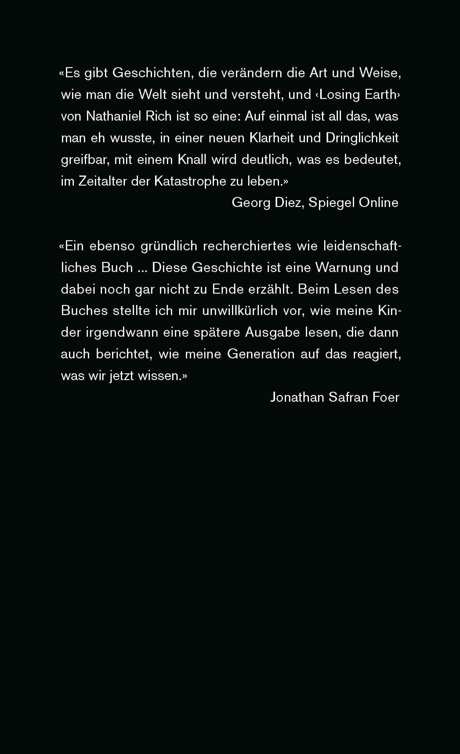 Es gibt Geschichten, die verändern die Art und Weise, wie man die Welt sieht und versteht, und "Losing Earth" von Nathaniel Rich ist so eine. Auf einmal ist all das, was man eh wusste, in einer neuen Klarheit und Dringlichkeit greifbar, mit einem Knall wird deutlich, was es bedeutet, im Zeitalter der Katastrophe zu leben. Georg Diez Spiegel Online 20190225