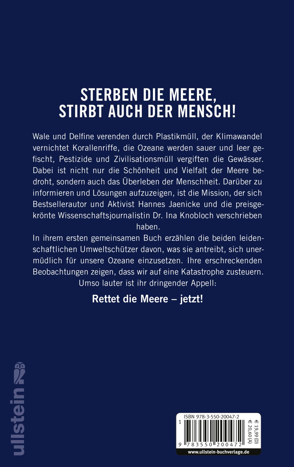 Wale und Delfine verenden durch Plastikmüll, der Klimawandel vernichtet Korallenriffe, die Ozeane werden leer gefischt, Pestizide und Zivilisationsmüll vergiften diesen Lebensraum. Zahlreiche Umweltsünden stellen eine dramatische Bedrohung für die einzigartige Unterwasserwelt dar. Dabei ist nicht nur die Schönheit und Vielfalt der Meere bedroht, sondern auch das Überleben der Menschheit. Darüber zu informieren und Lösungen aufzuzeigen, ist die Mission, der sich Bestsellerautor und Aktivist Hannes Jaenicke und Wissenschaftsjournalistin Dr. Ina Knobloch verschrieben haben. In ihrem ersten gemeinsamen Buch erzählen die beiden Vollblut-Umweltschützer davon, was sie antreibt, sich unermüdlich für unsere Ozeane einzusetzen. Ihre erschreckenden Beobachtungen zeigen, dass wir kurz vor der Katastrophe stehen. Umso lauter ist ihr dringender Appell: Rettet die Meere - jetzt!