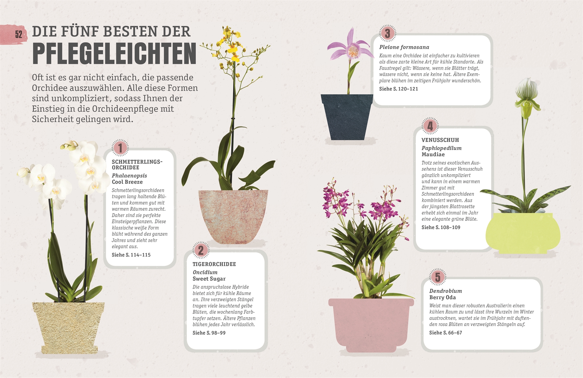 Orchideen im Porträt: Hier lernen Sie, wie viel Sie wässern dürfen, welchen Dünger die Pflanze braucht und welcher Standort geeignet ist. Sie erhalten kompakte Informationen und Pflegetipps für 143 prächtige Orchideen, damit die Pflanzen gedeihen und Jahr für Jahr verlässlich blühen. Steckbriefe zu zahlreichen Orchideen bieten fundierte Fakten zu Kategorie, Heimat, Wuchs und Größe.