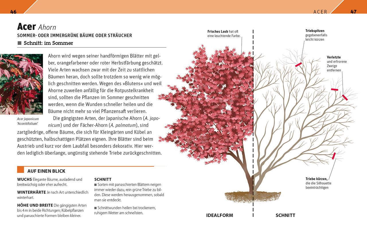 - Grundlagen : Wann und warum schneiden?, Werkzeug und seine Pflege, Pflanz- und Erziehungsschnitt, Verjüngungsschnitt, Spezielle Effekte (Kletterpflanzen, Hochstämme, Formschnitt, Hecken).