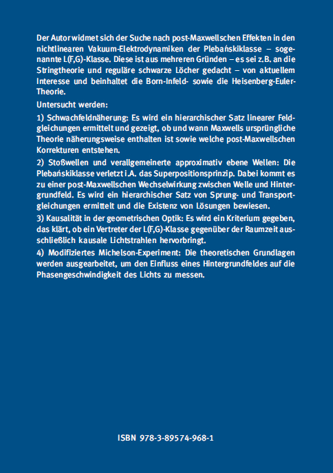 Der Autor widmet sich der Suche nach post-Maxwellschen Effekten in den nichtlinearen Vakuum-Elektrodynamiken der Plebańskiklasse – sogenannte L(F,G)-Klasse. Diese ist aus mehreren Gründen – es sei z.B. an die Stringtheorie und reguläre schwarze Löcher gedacht – von aktuellem Interesse und beinhaltet die Born-Infeld- sowie die Heisenberg-Euler-Theorie. Untersucht werden: