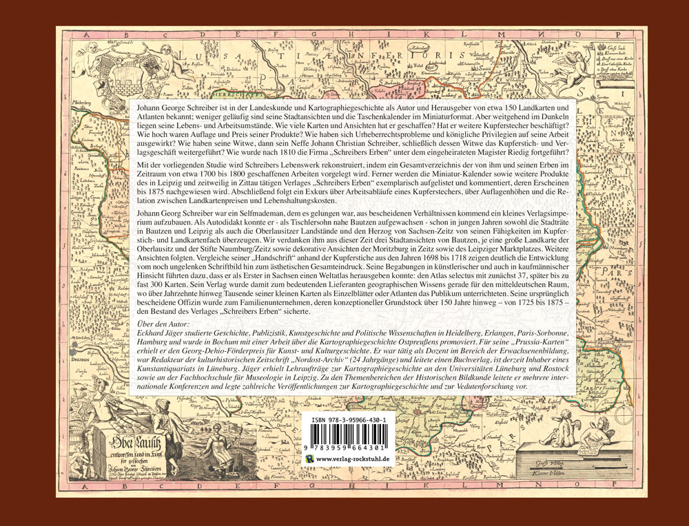 Autor Eckhard Jäger, Festeinband im Querformat 29,7 x 21 cm, 98 Seiten, 105 Abbildungen. ÜBER DAS BUCH:Johann George Schreiber ist in der Landeskunde und Kartographiegeschichte als Autor und Herausgeber von etwa 150 Landkarten und Atlanten bekannt; weniger geläufig sind seine Stadtansichten und die Taschenkalender im Miniaturformat. Aber weitgehend im Dunkeln liegen seine Lebens- und Arbeitsumstände. Wie viele Karten und Ansichten hat er geschaffen? Hat er weitere Kupferstecher beschäftigt? Wie hoch waren Auflage und Preis seiner Produkte? Wie haben sich Urheberrechtsprobleme und königliche Privilegien auf seine Arbeit ausgewirkt? Wie haben seine Witwe, dann sein Neffe Johann Christian Schreiber, schließlich dessen Witwe das Kupferstich- und Verlagsgeschäft weitergeführt? Wie wurde nach 1810 die Firma "Schreibers Erben" unter dem eingeheirateten Magister Riedig fortgeführt? Mit der vorliegenden Studie wird Schreibers Lebenswerk rekonstruiert, indem ein Gesamtverzeichnis der von ihm und seinen Erben im Zeitraum von etwa 1700 bis 1800 geschaffenen Arbeiten vorgelegt wird. Ferner werden die Miniatur-Kalender sowie weitere Produkte des in Leipzig und zeitweilig in Zittau tätigen Verlages "Schreibers Erben" exemplarisch aufgelistet und kommentiert, deren Erscheinen bis 1875 nachgewiesen wird. Abschließend folgt ein Exkurs über Arbeitsabläufe eines Kupferstechers, über Auflagenhöhen und die Relation zwischen Landkartenpreisen und Lebenshaltungskosten.Johann Georg Schreiber war ein Selfmademan, dem es gelungen war, aus bescheidenen Verhältnissen kommend ein kleines Verlagsimperium aufzubauen. Als Autodidakt konnte er - als Tischlersohn nahe Bautzen aufgewachsen - schon in jungen Jahren sowohl die Stadträte in Bautzen und Leipzig als auch die Oberlausitzer Landstände und den Herzog von Sachsen-Zeitz von seinen Fähigkeiten im Kupferstich- und Landkartenfach überzeugen. Wir verdanken ihm aus dieser Zeit drei Stadtansichten von Bautzen, je eine große Landkarte der Oberlausitz und der Stifte Naumburg/Zeitz sowie dekorative Ansichten der Moritzburg in Zeitz sowie des Leipziger Marktplatzes. Weitere Ansichten folgten. Vergleiche seiner "Handschrift" anhand der Kupferstiche aus den Jahren 1698 bis 1718 zeigen deutlich die Entwicklung vom noch ungelenken Schriftbild hin zum ästhetischen Gesamteindruck. Seine Begabungen in künstlerischer und auch in kaufmännischer Hinsicht führten dazu, dass er als Erster in Sachsen einen Weltatlas herausgeben konnte: den Atlas selectus mit zunächst 37, später bis zu fast 300 Karten. Sein Verlag wurde damit zum bedeutenden Lieferanten geographischen Wissens gerade für den mitteldeutschen Raum, wo über Jahrzehnte hinweg Tausende seiner kleinen Karten als Einzelblätter oder Atlanten das Publikum unterrichteten. Seine ursprünglich bescheidene Offizin wurde zum Familienunternehmen, deren konzeptioneller Grundstock über 150 Jahre hinweg - von 1725 bis 1875 - den Bestand des Verlages "Schreibers Erben" sicherte.