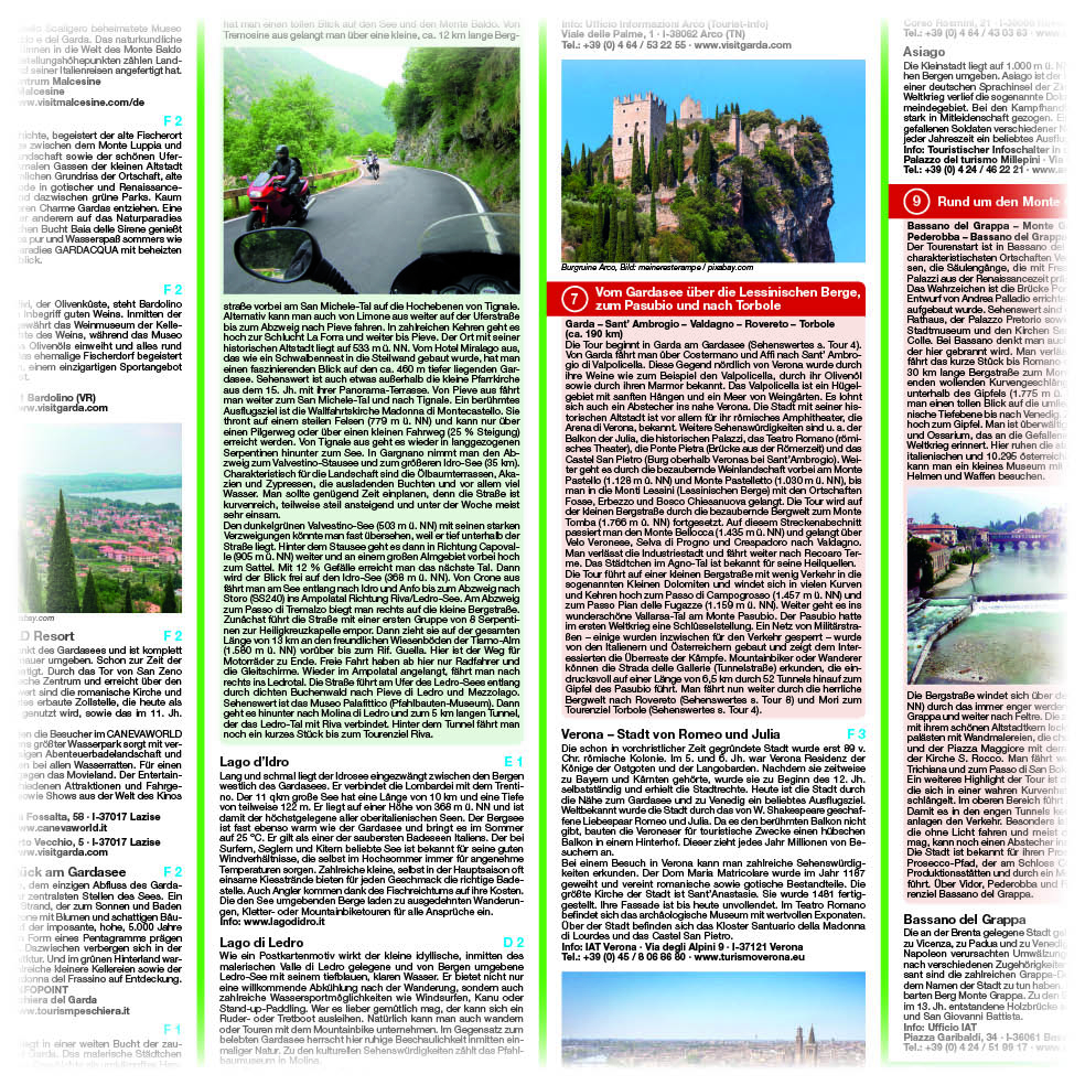 Die Motorradkarte stellt 13 Tourenvorschläge von 150 bis 250 km Länge in Norditalien vor. Sie führen durch die Dolomiten vom Trentino im Westen bis zum Friaul im Osten der Südtiroler Alpen. Zu bewältigen sind kurvenreiche Passstraßen, die den erfahrenen Biker bis auf max. 2033 m ü. NN führen. Belohnt wird er mit Ausblicken auf die Berggipfel, die italienische Tiefebene und den Gardasee. Weitere Touren führen um den Gardasee mit seinen engen Uferstraßen und in die Lagunenstadt Venedig mit seinen Kanälen, seiner Rialtobrücke oder dem Dom am Markusplatz. Auf der Rückseite der Motorradkarte finden sich ausführliche ausschließlich deutschsprachige Informationen zu den Strecken.