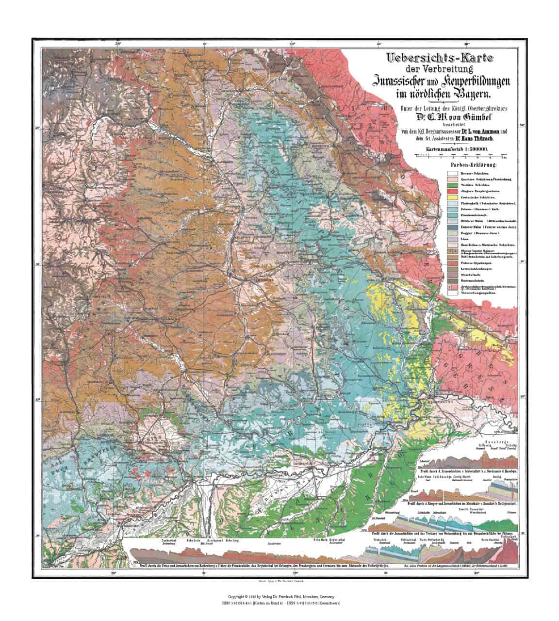| Zusatzinfo | 5 Karten 1 : 100 000 XIII Bamberg, XIV Neumarkt, XV Ingolstadt, XVI Nördlingen und XVII Ansbach und 1 Übersichtskarte der Verbreitung Jurassischer und Keuperbildungen im nördlichen Bayern 1 : 500 000 |