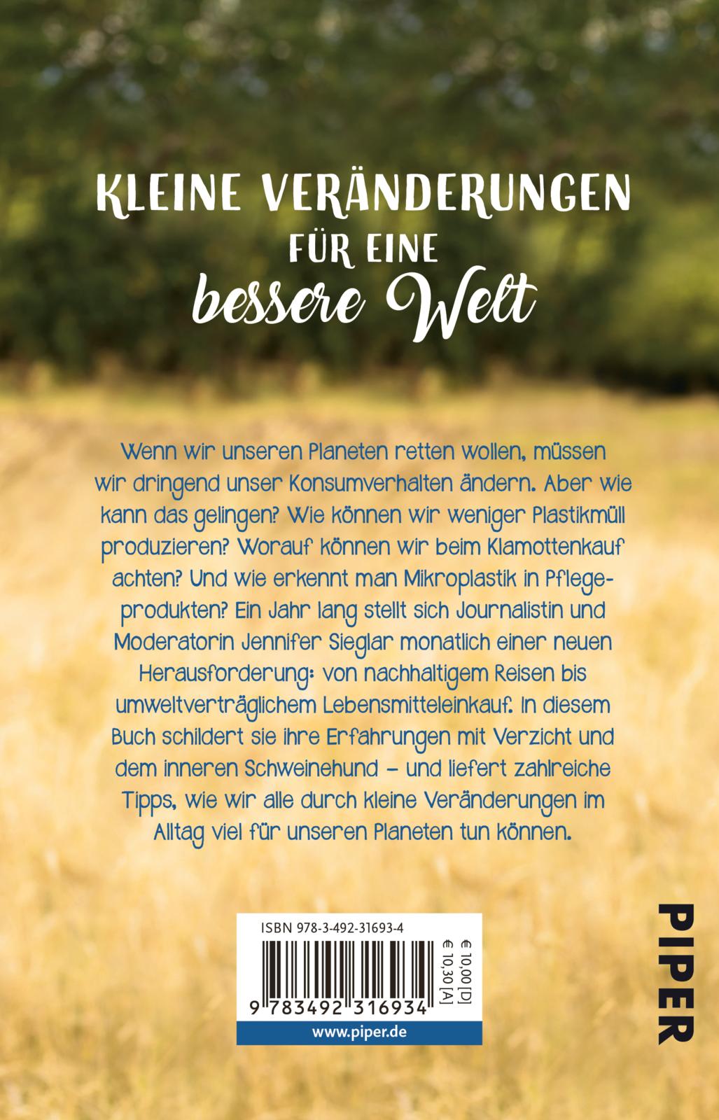 Wenn wir unseren Planeten retten wollen, müssen wir dringend unser Konsumverhalten ändern. Aber wie kann das gelingen? Wie können wir weniger Plastikmüll produzieren? Worauf können wir beim Klamottenkauf achten? Und wie erkennt man Mikroplastik in Pflegeprodukten? In ihrem umweltfreundlichen Jahr stellt sich Journalistin und TV-Moderatorin Jennifer Sieglar monatlich einer neuen Herausforderung: von nachhaltigem Reisen bis zu umweltverträglichem Lebensmitteleinkauf. In diesem Buch schildert sie ihre spannenden Erfahrungen mit Verzicht und dem inneren Schweinehund - und liefert zahlreiche Tipps, wie wir alle durch kleine Veränderungen im Alltag viel für unseren Planeten tun können. Denn wenn viele ein bisschen was tun, kann das in der Summe Großes bewirken!