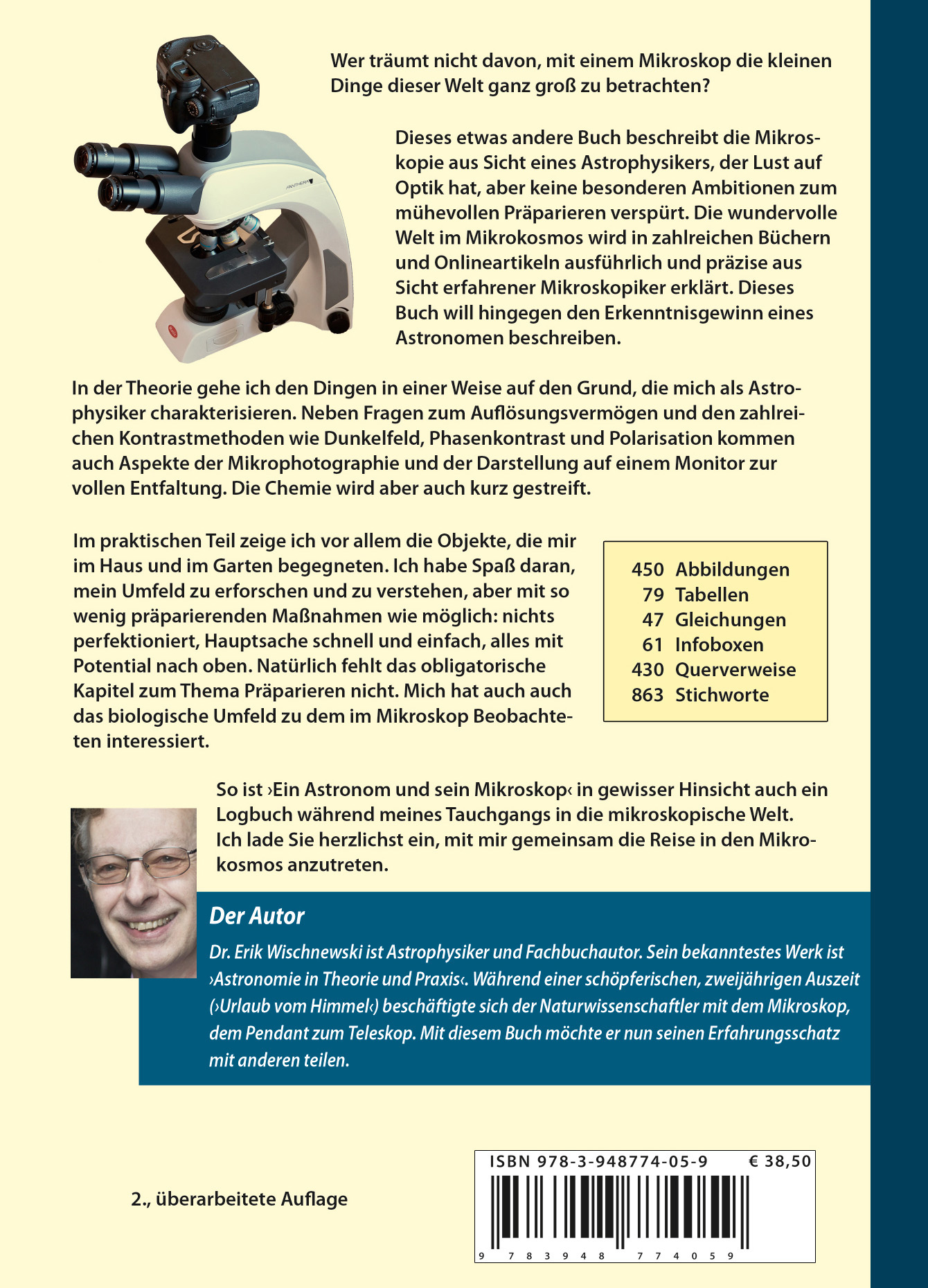 Highlights: 450 Abbildungen, 79 Tabellen, 61 Informationskästen, 47 Formeln, 430 Querverweise, 860 Stichworten. Dieses etwas andere Buch beschreibt die Mikroskopie aus Sicht eines Astrophysikers. Das Buch beschreibt ausführlich den Erkenntnisgewinn eines Einsteigers und ist somit ein nützlicher Helfer für den startenden Mikroskopiefreund.