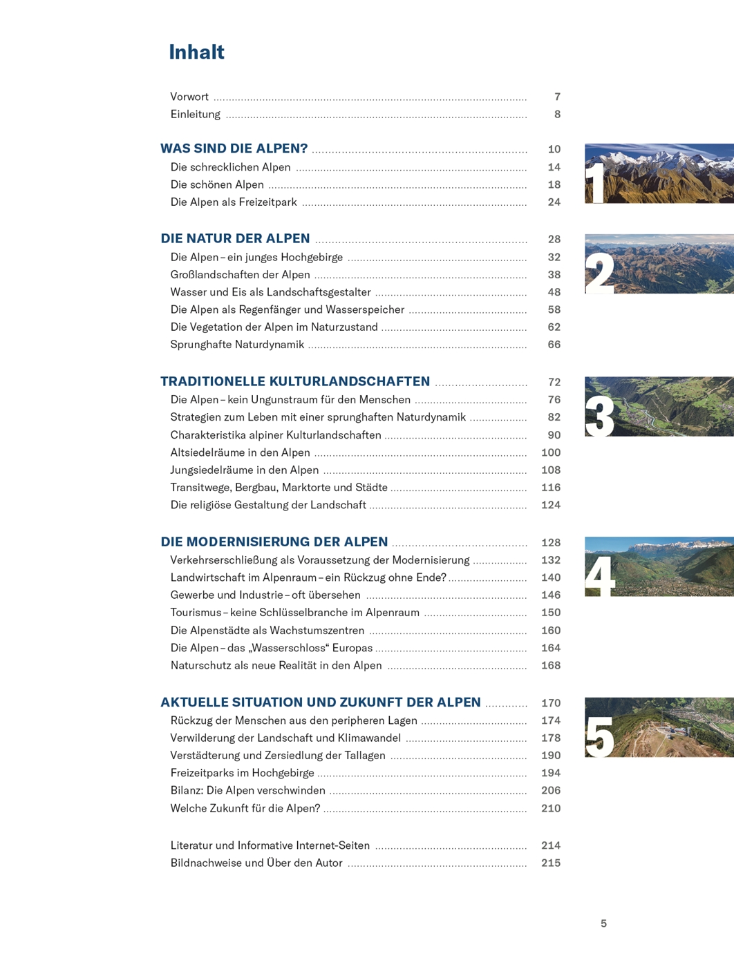 Vorwort . 7Einleitung . 8WAS SIND DIE ALPEN? . 10Die schrecklichen Alpen . 14Die schönen Alpen . 18Die Alpen als Freizeitpark . 24DIE NATUR DER ALPEN . 28Die Alpen - ein junges Hochgebirge . 32Großlandschaften der Alpen 38Wasser und Eis als Landschaftsgestalter . 48Die Alpen als Regenfänger und Wasserspeicher . 58Die Vegetation der Alpen im Naturzustand 62Sprunghafte Naturdynamik 66TRADITIONELLE KULTURLANDSCHAFTEN . 72Die Alpen - kein Ungunstraum für den Menschen . 76Strategien zum Leben mit einer sprunghaften Naturdynamik 82Charakteristika alpiner Kulturlandschaften 90Altsiedelräume in den Alpen 100Jungsiedelräume in den Alpen . 108Transitwege, Bergbau, Marktorte und Städte 116Die religiöse Gestaltung der Landschaft 124DIE MODERNISIERUNG DER ALPEN 128Verkehrserschließung als Voraussetzung der Modernisierung 132Landwirtschaft im Alpenraum - ein Rückzug ohne Ende? 140Gewerbe und Industrie - oft übersehen . 146Tourismus - keine Schlüsselbranche im Alpenraum . 150Die Alpenstädte als Wachstumszentren . 160Die Alpen - das "Wasserschloss" Europas 164Naturschutz als neue Realität in den Alpen . 168AKTUELLE SITUATION UND ZUKUNFT DER ALPEN . 170Rückzug der Menschen aus den peripheren Lagen 174Verwilderung der Landschaft und Klimawandel . 178Verstädterung und Zersiedlung der Tallagen . 190Freizeitparks im Hochgebirge 194Bilanz: Die Alpen verschwinden . 206Welche Zukunft für die Alpen? 210Literatur und Informative Internet-Seiten . 214Bildnachweise und Über den Autor . 215