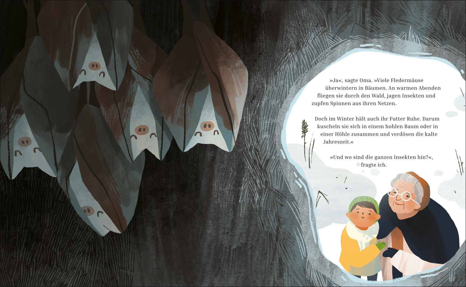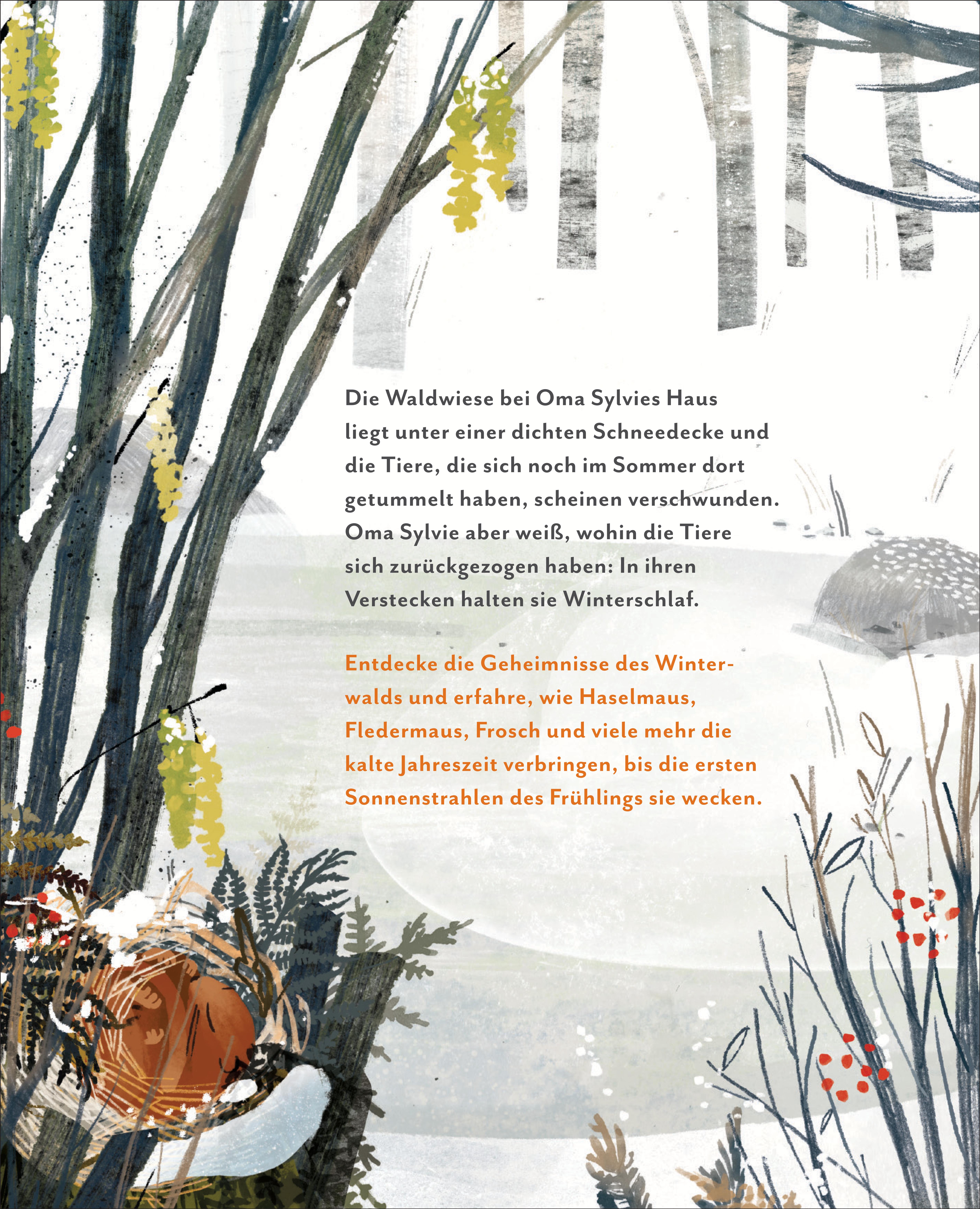 In den Ferien bei Oma Sylvie gibt es so viel zu entdecken: Auf der Frühlingswiese huschen Haselmäuse vorbei, summen Insekten und in der Dämmerung beeindruckt die Fledermaus mit ihren Flugkünsten. Doch ein paar Monate später sieht die Wiese ganz verändert aus. Alles liegt unter einer dichten Schneeschicht und von den vielen Tieren ist nichts mehr zu sehen. Wohin sind sie verschwunden? Oma Sylvie weiß, wo die Tiere sich versteckt haben. Im Boden eingegraben oder warm eingekuschelt in kleinen Höhlen warten sie auf die ersten Sonnenstrahlen. Sie alle schlummern friedlich, bis die Frühlingswärme sie weckt.