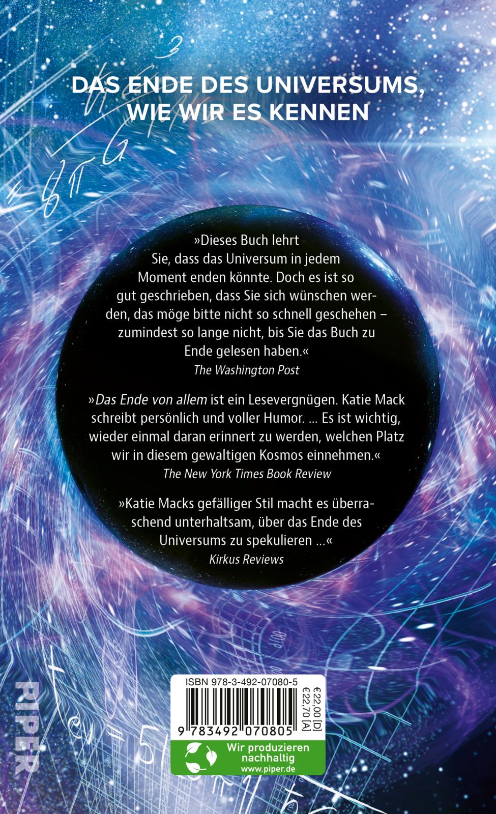 Die renommierte Astrophysikerin Katie Mack beschäftigt sich seit ihren frühen Studienjahren mit diesen und ähnlichen Fragen. In diesem Buch nimmt sie uns mit auf eine faszinierende Reise zu den Grenzen von Raum und Zeit und zeigt auf unterhaltsame Weise, was die Wissenschaft über das Ende des Kosmos weiß.