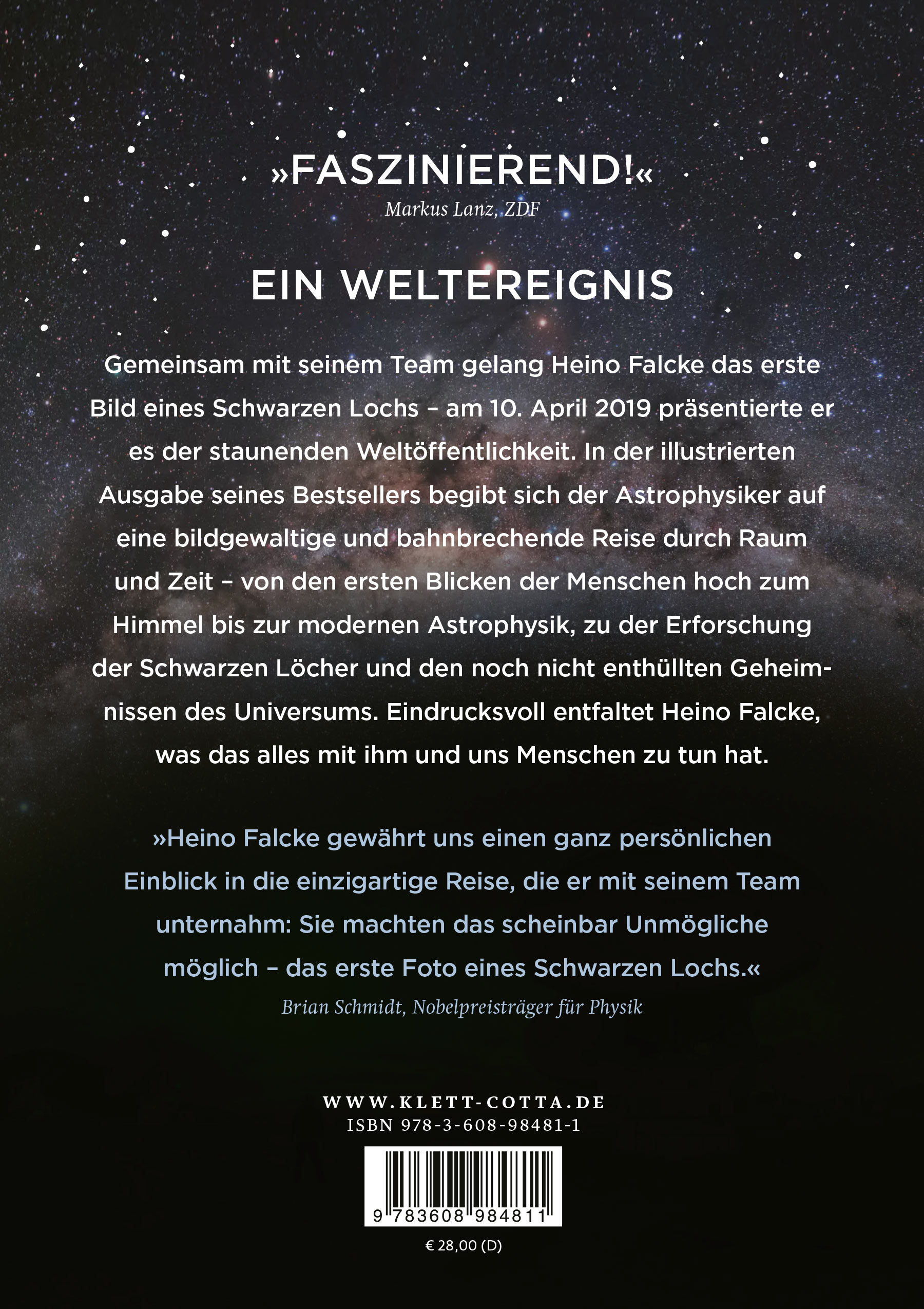 »[...] Vor welche technischen und organisatorischen Schwierigkeiten das Vorhaben, ein Schwarzes Loch abzulichten, die beteiligten Wissenschaftler stellte und wie es im Frühjahr 2017 schließlich gelang, daraus hat Falcke nun mit Unterstützung des Journalisten Jörg Römer ein wunderbares Buch gemacht.« Ulf von Rauchhaupt, FAZ, 21. November 2020 Ulf von Rauchhaupt FAZ 20201121