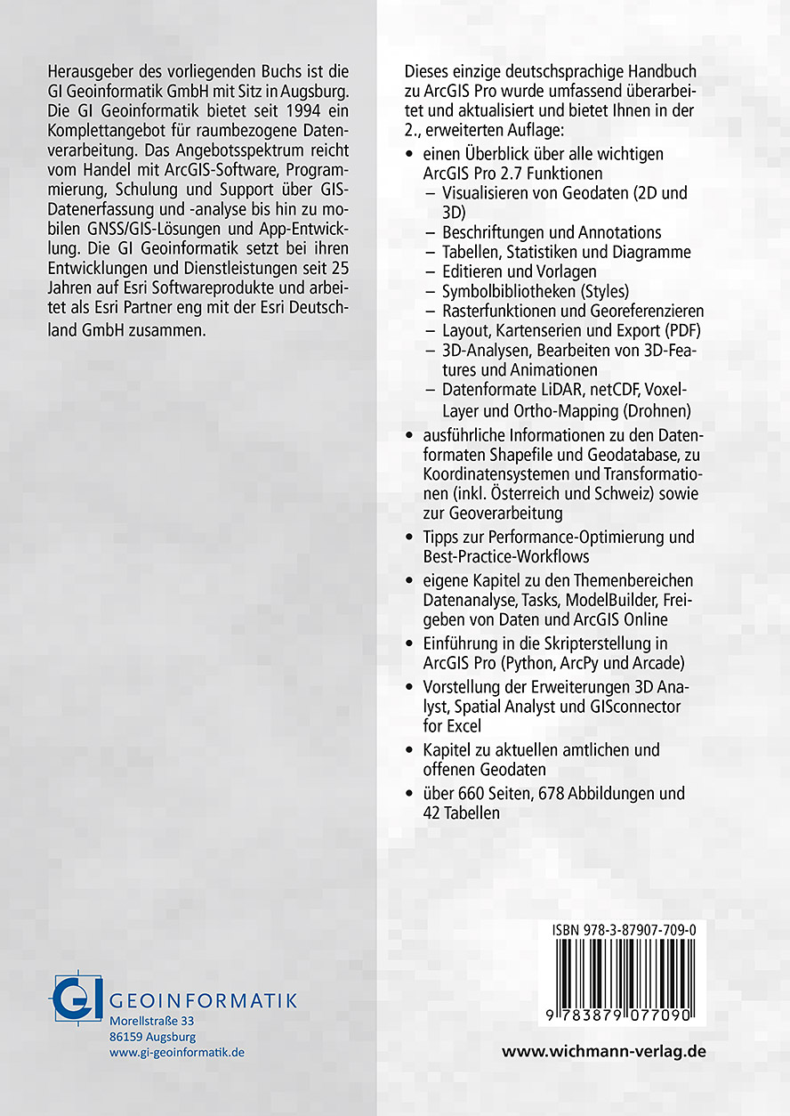 Dieses einzige deutschsprachige Handbuch zu ArcGIS Pro wurde umfassend überarbeitet und aktualisiert und bietet Ihnen in der 2., erweiterten Auflage:- einen Überblick über alle wichtigen ArcGIS Pro 2.7 Funktionen- Visualisieren von Geodaten (2D und 3D)- Beschriftungen und Annotations- Tabellen, Statistiken und Diagramme- Editieren und Vorlagen- Symbolbibliotheken (Styles)- Rasterfunktionen und Georeferenzieren- Layout, Kartenserien und Export (PDF)- 3D-Analysen, Bearbeiten von 3D-Features und Animationen- Datenformate LiDAR, netCDF, Voxel-Layer und Ortho-Mapping (Drohnen)- ausführliche Informationen zu den Datenformaten Shapefile und Geodatabase, zu Koordinatensystemen und Transformationen (inkl. Österreich und Schweiz) sowie zur Geoverarbeitung- Tipps zur Performance-Optimierung und Best-Practice-Workflows- eigene Kapitel zu den Themenbereichen Datenanalyse, Tasks, ModelBuilder, Freigeben von Daten und ArcGIS Online- Einführung in die Skripterstellung in ArcGIS Pro (Python, ArcPy und Arcade)- Vorstellung der Erweiterungen 3D Analyst, Spatial Analyst und GISconnector for Excel- Kapitel zu aktuellen amtlichen und offenen Geodaten- über 660 Seiten, 678 Abbildungen und 42 Tabellen