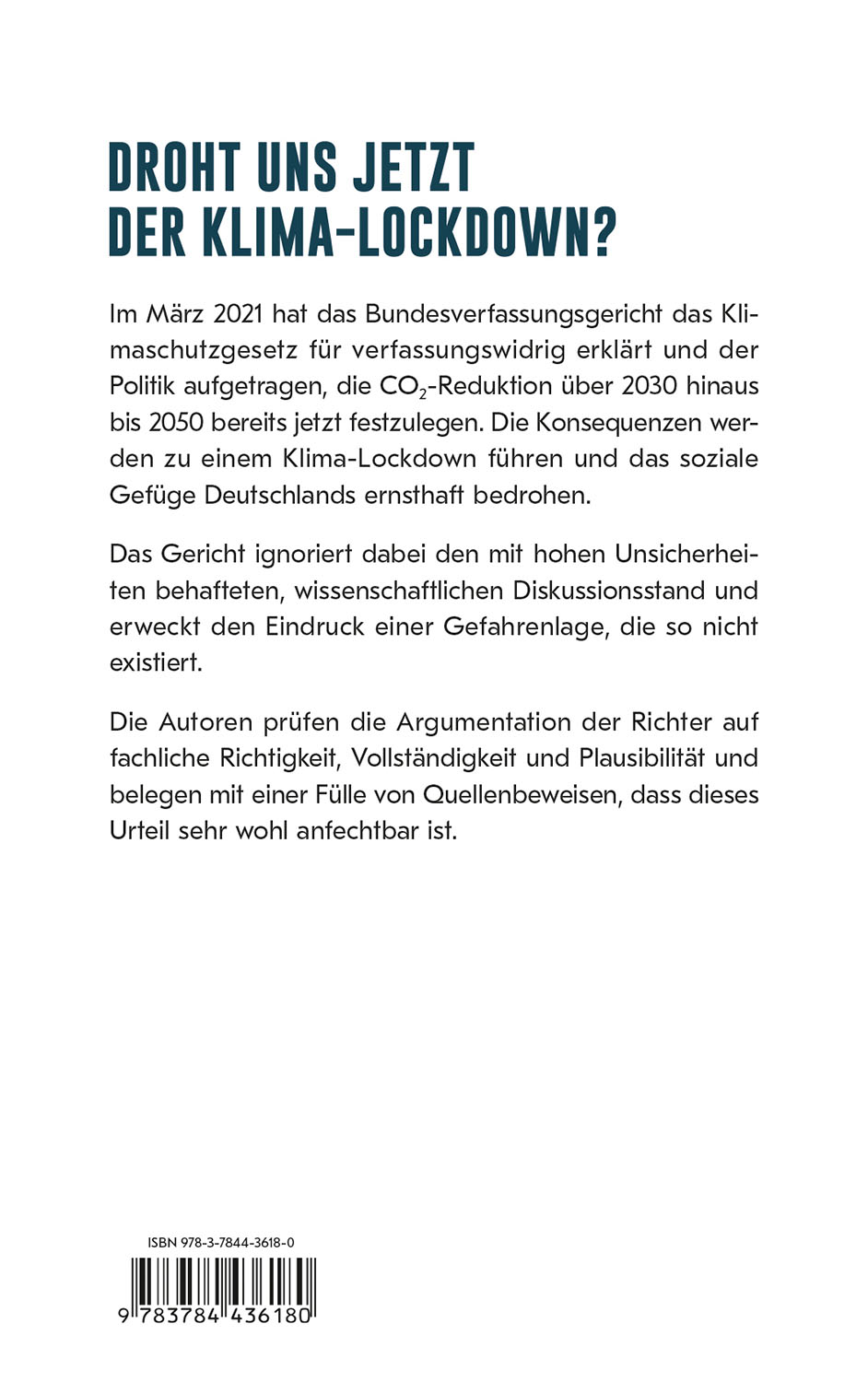 Im März 2021 hat das Bundesverfassungsgericht das Klimaschutzgesetz für verfassungswidrig erklärt und der Politik aufgetragen, die CO2-Reduktion über 2030 hinaus bis 2050 bereits jetzt zu regeln. Die Konsequenzen werden zu einem Klima-Lockdown führen und das soziale Gefüge Deutschlands auseinanderreißen.Das Gericht ignoriert dabei den mit hohen Unsicherheiten behafteten wissenschaftlichen Diskussionsstand und erweckt fälschlicherweise den Eindruck einer alternativlosen Gefahrenlage. Dieses Buch will zu einer faktenorientierten Diskussion des Urteils beitragen und prüft die Argumentation auf fachliche Richtigkeit, Vollständigkeit und Plausibilität. Die Autoren belegen mit einer Fülle von Quellenverweisen eindrucksvoll, auf welchen fehlerhaften Annahmen dieser folgenschwere Beschluss beruht.
