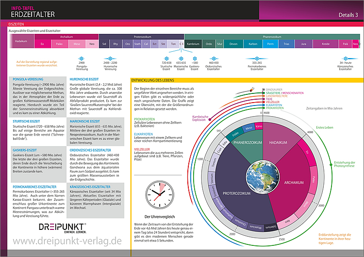 Zusätzlich zeigt das zweiteilige Info-Tafel-Set die Entstehung des Lebens im übersichtlichen Runddiagramm und die wichtigsten (globalen) Eiszeiten werden erläutert.
