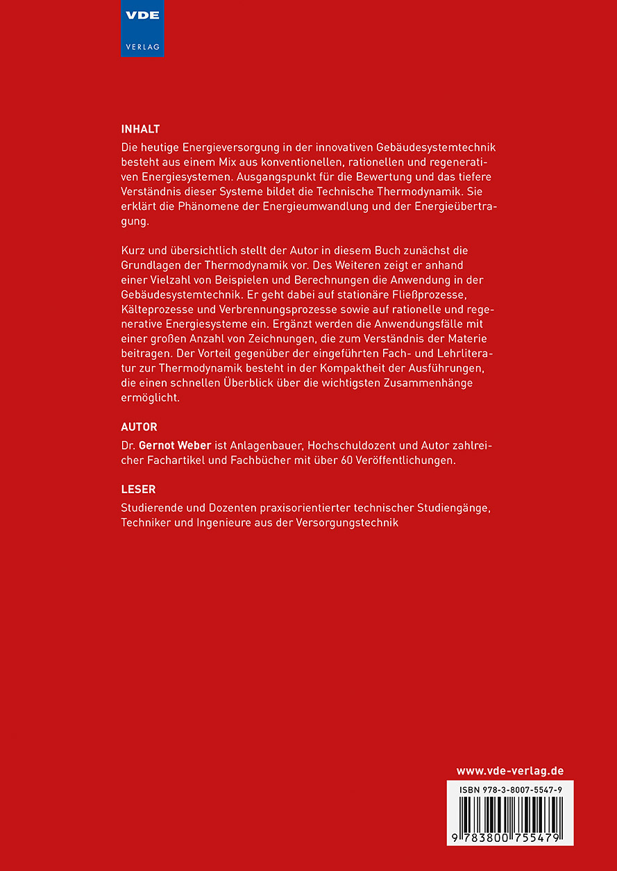 Die heutige Energieversorgung in der innovativen Gebäudesystemtechnik besteht aus einem Mix aus konventionellen, rationellen und regenerativen Energiesystemen. Ausgangspunkt für die Bewertung und das tiefere Verständnis dieser Systeme bildet die Technische Thermodynamik. Sie erklärt die Phänomene der Energieumwandlung und der Energieübertragung.Kurz und übersichtlich stellt der Autor in diesem Buch zunächst die Grundlagen der Thermodynamik vor. Des Weiteren zeigt er anhand einer Vielzahl von Beispielen und Berechnungen die Anwendung in der Gebäudesystemtechnik. Er geht dabei auf stationäre Fließprozesse, Kälteprozesse und Verbrennungsprozesse sowie auf rationelle und regenerative Energiesysteme ein. Ergänzt werden die Anwendungsfälle mit einer großen Anzahl von Zeichnungen, die zum Verständnis der Materie beitragen. Der Vorteil gegenüber der eingeführten Fach- und Lehrliteratur zur Thermodynamik besteht in der Kompaktheit der Ausführungen, die einen schnellen Überblick über die wichtigsten Zusammenhänge ermöglicht.