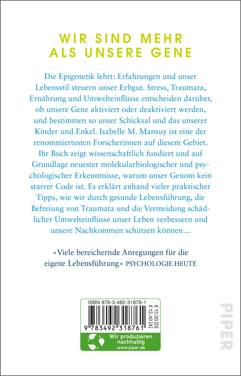 Isabelle Mansuy, geboren 1965, ist Professorin für Neuroepigenetik an der Universität Zürich und der Eidgenössischen Technischen Hochschule (ETH), Co-Direktorin des Hirnforschungsinstituts der Universität Zürich und stellvertretende Leiterin des Instituts für Neurowissenschaften an der ETH. Sie beschäftigt sich u. a. mit der Frage, auf welche Weise sich die Folgen von Traumata, Unglück und Verbrechen in unserem Körper einnisten und wir sie an unsere Kinder weitergeben.