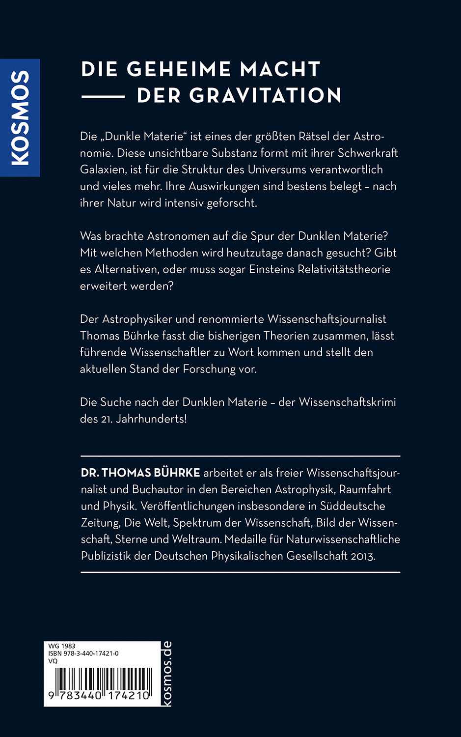 Die sogenannte "Dunkle Materie" ist eines der größten Rätsel der Astronomie. Die unsichtbare Kraft formt Galaxien, bestimmt die Struktur des Universums - und spaltet die Wissenschaft. Doch was brachte die Forschung auf die Spur der Dunklen Materie? Mit welchen Methoden wird heutzutage danach gesucht? Welche Alternativen gibt es und was würde das für unser Verständnis vom Weltall bedeuten? Der renommierte Wissenschaftsjournalist Thomas Bührke schildert die bisherigen Theorien, Experimente und Ergebnisse, lässt führende Wissenschaftler zu Wort kommen und stellt den aktuellen Stand der Forschung vor.