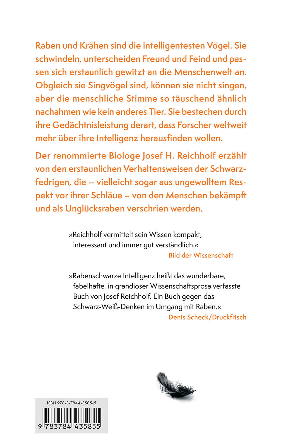Kolkraben und ihre Verwandten, die Raben-, Nebel- und Saatkrähen, Dohlen, Elstern und Eichelhäher, sind so intelligent, dass sie es mitunter sogar mit der Intelligenz von Primaten aufnehmen können. Reichholfs Studien über freilebende und von Hand aufgezogene Rabenvögel belegen, dass die ungeliebten Vögel fähig sind, ihre tierischen und menschlichen Partner sowie alle anderen Vögel im Schwarm genau zu erkennen, unfreundliche Lebewesen zu bestrafen, ihre Konkurrenz beim Verstecken von Aas zu täuschen oder Wölfe gekonnt in Schach zu halten. Im Boden versteckte Walnüsse finden Rabenkrähen auch nach Monaten mühelos wieder. In Japan kann man sogar beobachten, dass Krähen Nüsse bei Rot an Ampelanlagen vor Autos platzieren, um sie in der nächsten Rotphase frisch geknackt wieder abzuholen. Kaum ein Mensch hätte dem ungeliebten "schwarzen Gesellen" solche Findigkeiten zugetraut. Tut sich der Mensch mit den Rabenvögeln vielleicht gerade wegen ihrer unglaublichen Intelligenz so schwer? Der Erfolgsautor Josef H. Reichholf hat auch auf diese Frage überzeugende Antworten gefunden.