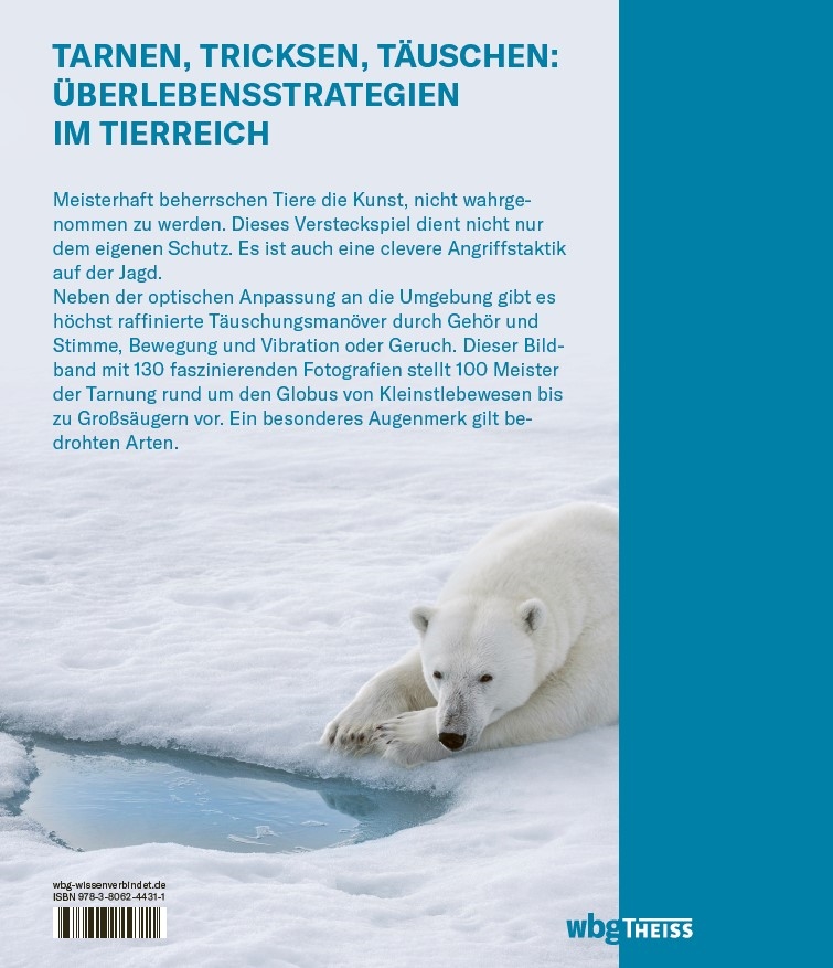 | Schlagworte | Afrika • Amphibien • Anpassung • Anpassungsfähige Tiere • Asien • Bedrohte Arten • Bildband • Bildband Tiere • Biologie • Echsen • Eisbär • Europa • Fische • Geschenk für Tierliebhaber • Insekten • Jaguar • Krabbenspinne • Krypsis • Leopard • Mimikry • Muster Tiere • Naturfotografie • Nordamerika • Orca • Ozean • Ozeanien • Rindenskorpion • Säugetiere • Schneehuhn • Somatolyse • Südamerika • Tarnfärbung bei Tieren • Tarntracht • Tarnung • Täuschen • Tiere die sich tarnen • Tierfotografie • Tierporträts • Tiger • Transparente Tiere • Überlebensstrategie • Verhaltensbiologie • Vögel • Warntracht • wie Tiere ihr Aussehen verändern • wie Tiere sich verstecken • Wissen über Tiere |