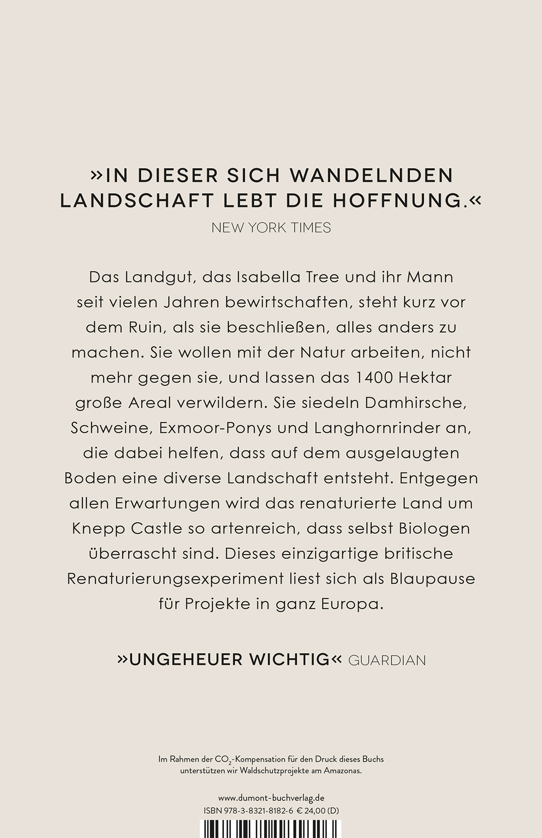 »Ein Buch, bei dem man das Gefühl hat, wirklich auf jeder Seite was zu lernen.« Sophia Feldmer, FREUNDIN »Da will man doch gleich zur Safari nach Sussex düsen!« Jana Felgenhauer, BARBARA »Die Autorin hat die seltene Fähigkeit, zu schwärmen, ohne sentimental zu werden.« Susanne Lehmstoll, DER TAGESSPIEGEL »Es ist eine toll erzählte Geschichte mit wahnsinnig vielen Informationen. Auf jeder Seite gibt es irgendwas neues zu erfahren. [...] Isabella Tree gelingt es wirklich den Leser oder die Leserin von der ersten Seite an in diese spannende Entwicklungsgeschichte reinzuziehen. [...] Es ist einfach schlicht ein großartiges Buch.« Claudia Kleen, HR2 NEUE BÜCHER »Renaturierung durch Loslassen, aber auch durch das Schaffen von Bedingungen, unter denen die Natur sich frei entfalten kann - mit diesem Motto gehen die beiden Rewilding-Pioniere aus West Sussex einen anderen Weg als der konventionelle Umweltschutz.« Astrid Stevers, GARTEN ART MAGAZIN »Ein wichtiges, wunderbares Buch für alle! « Thomas Gießelmann, ZEITENWENDE »Ein bahnbrechendes Renaturierungsprojekt - und ein poetisches Zeugnis von der Kraft der Natur!« Tina Schraml, BÜCHER MAGAZIN »Tree beschreibt den Prozess, wie aus ausgelaugtem Agrar- und Weideland in atemberaubendem Tempo wieder ein reiches Ökosystem wird, auf anschauliche und spannende Weise.« Björn Gabel, GOSLARSCHE ZEITUNG »Dieses ist eines der inspirierendsten Bücher, die je im Fachgebiet Naturschutz geschrieben wurden. Es ist fachlich auf absolut hohem Niveau, aber zugleich leicht verständlich, leicht lesbar und auch mit einem geradezu literarischem Spannungsbogen geschrieben.« Herbert Nickel, NATURSCHUTZ & LANDSCHAFTSPLANUNG »[Isabella Tree] erklärt wunderbar anschaulich die ökologischen Zusammenhänge und widerlegt ganz nebenbei Lehrmeinungen, die bis heute an den Universitäten verkündet werden. [...] [Die] Mischung aus Experiment, Beobachtung und fundierter wissenschaftlicher Kritik hebt dieses Buch meilenweit aus der großen Masse von 'Naturschutzbüchern' hervor.« Volker M., BÜCHER.DE »Eine Geschichte, die nach einem Märchen klingt und doch wahr ist!« Sylvia Nause-Meier, HAPPYNEZ und TV HÖREN UND SEHEN