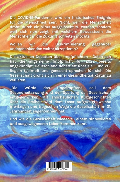 | Schlagworte | Angst • Autonomie • biopsychosozial • Corona-Virus • Covid-19 • Einsamkeit • Freiheit • Freundschaft • Grundrechte • Held • Impfzwang • Kurzgeschichten • Pandemie • Selbstbestimmung • Spaltung der Gesellschaft • Technokratie • Ungeimpfter • Utopie • Vertrauen • Virokratie • Werte • Wissenschaft • Würde • Zusammenhalt |