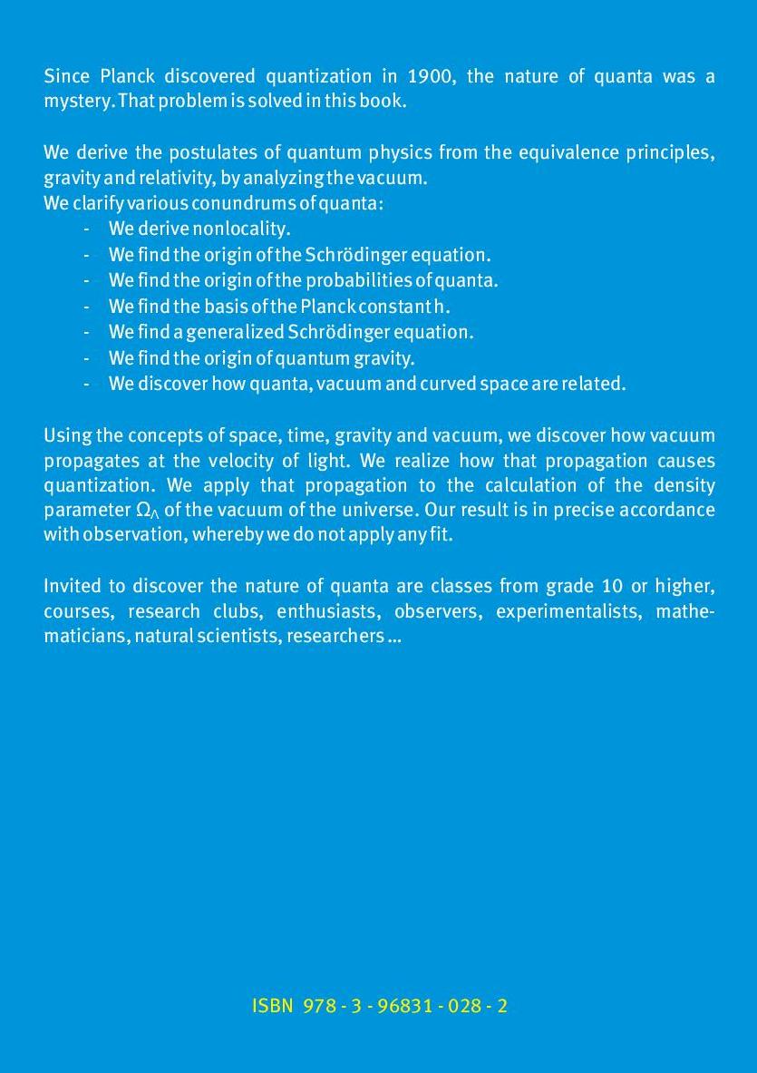 Since Planck discovered quantization in 1900, the nature of quanta was a mystery. That problem is solved in this book.