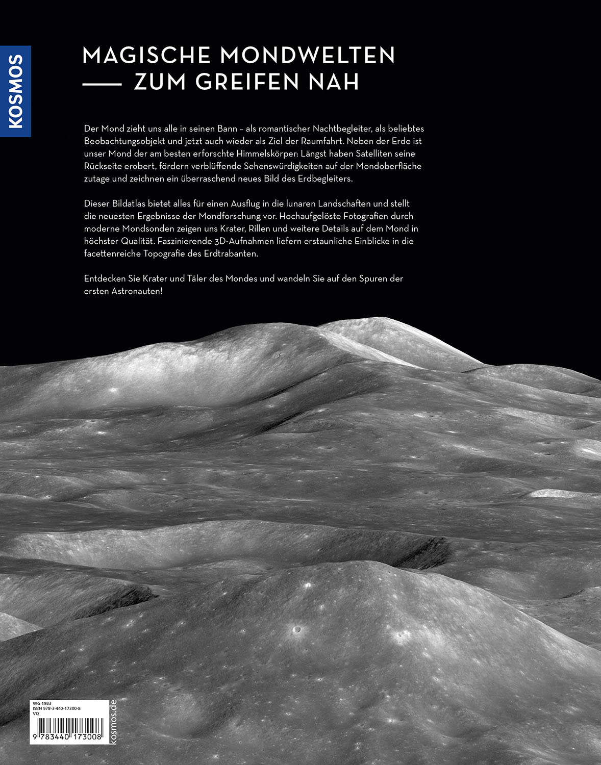 Dieser aufwendig gestaltete Band zeigt die Landschaften unseres Erdtrabanten in völlig neuem Licht. Neben einem kompletten Mond-Atlas, ergänzt durch das fantastische Bildmaterial des LRO, informiert er über die neuesten Erkenntnisse der Forschung, beschreibt den Mond als Nachtgestirn und Himmelskörper und berichtet über vergangene und zukünftige Mond-Missionen.
