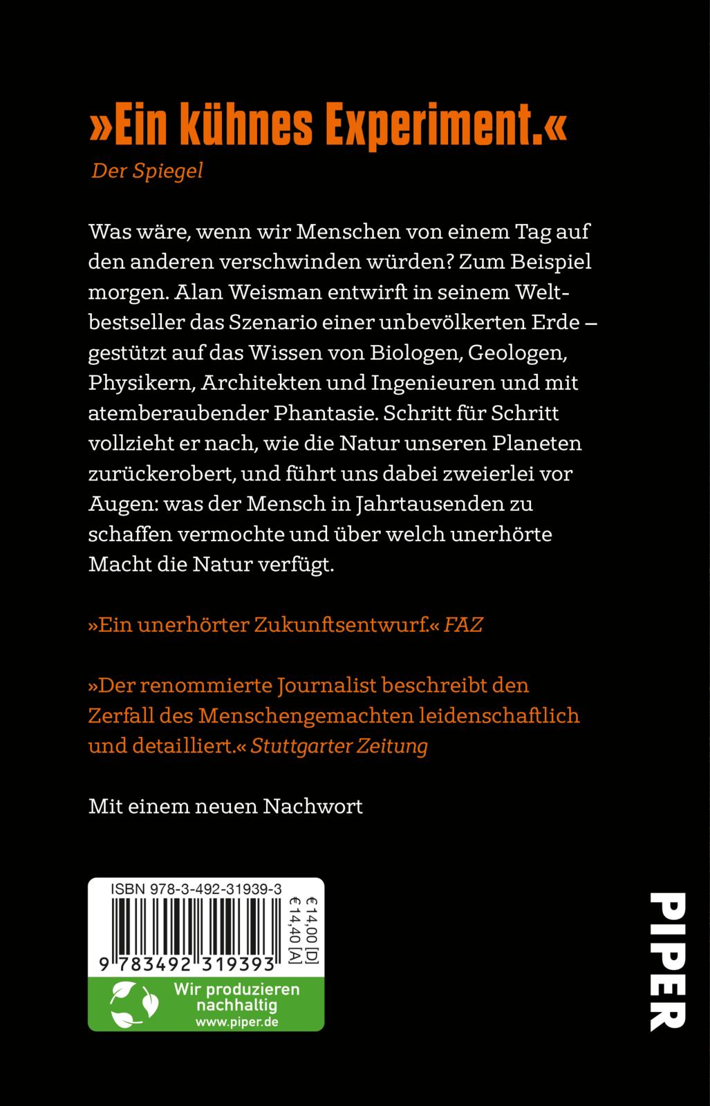 Was wäre, wenn wir Menschen von einem Tag auf den anderen verschwinden würden? Zum Beispiel morgen. Ein ungeheures Gedankenexperiment! Alan Weisman entwirft in seinem Weltbestseller das Szenario einer unbevölkerten Erde - gestützt auf das Wissen von Biologen, Geologen, Physikern, Architekten und Ingenieuren und mit atemberaubender Phantasie. Schritt für Schritt vollzieht Weisman nach, wie die Natur unseren Planeten zurückerobert, und führt dem Leser dabei zweierlei vor Augen: was der Mensch in Jahrtausenden zu schaffen vermochte und über welch unerhörte Macht die Natur verfügt.